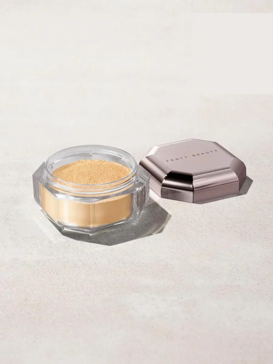 Fenty Beauty на 100% безопасен для здоровья. НЕ ЗАБУДЬТЕ! Поищите в коробке специальный колпачок, который надежно закрывает рассыпчатую пудру! Рианна любит кожу без пор, с матовым оттенком, но так и не смогла найти идеальную пудру, которая бы удовлетворила ее потребности. После 3-х лет совершенствования формулы она разработала идеальную пудру, которая делает кожу похожей на кожу, а не на корку, и подходит для всех типов кожи и оттенков. Это идеальный фильтр для использования в дороге, и он всегда лежит у нее в сумочке.