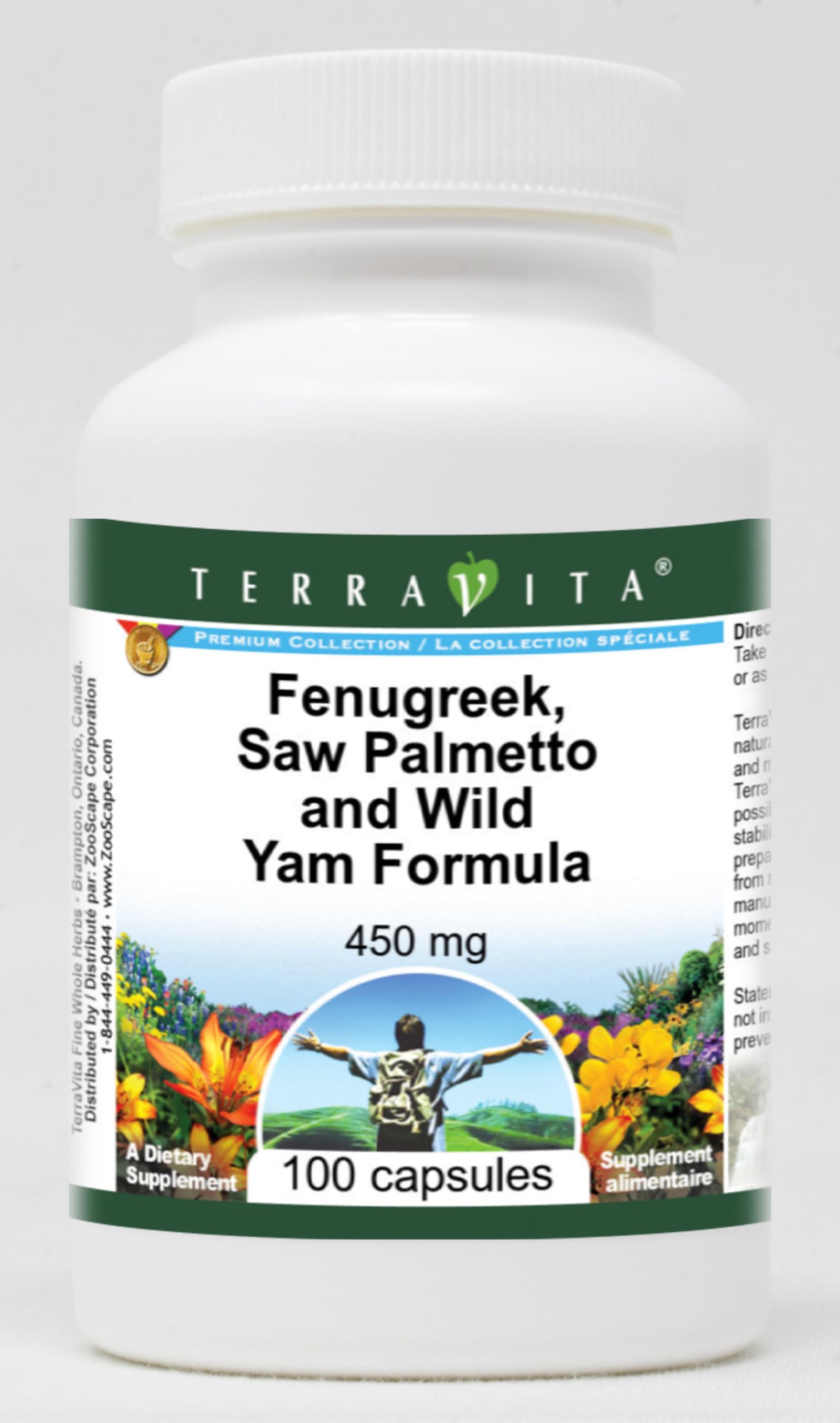 Fenugreek, Saw Palmetto and Wild Yam Formula - 450 mg (100 capsules, ZIN: 514008) Packaged in the United States in a GMP certified facility (Good Manufacturing Practice). No fillers. Manufacturer: TerraVita Size: 100 capsules Easy-to-swallow Capsules in a sealed bottle. Ingredients: Gelatin, Water, Saw Palmetto - 150 mg, Wild Yam - 150 mg, Fenugreek Seed - 150 mg