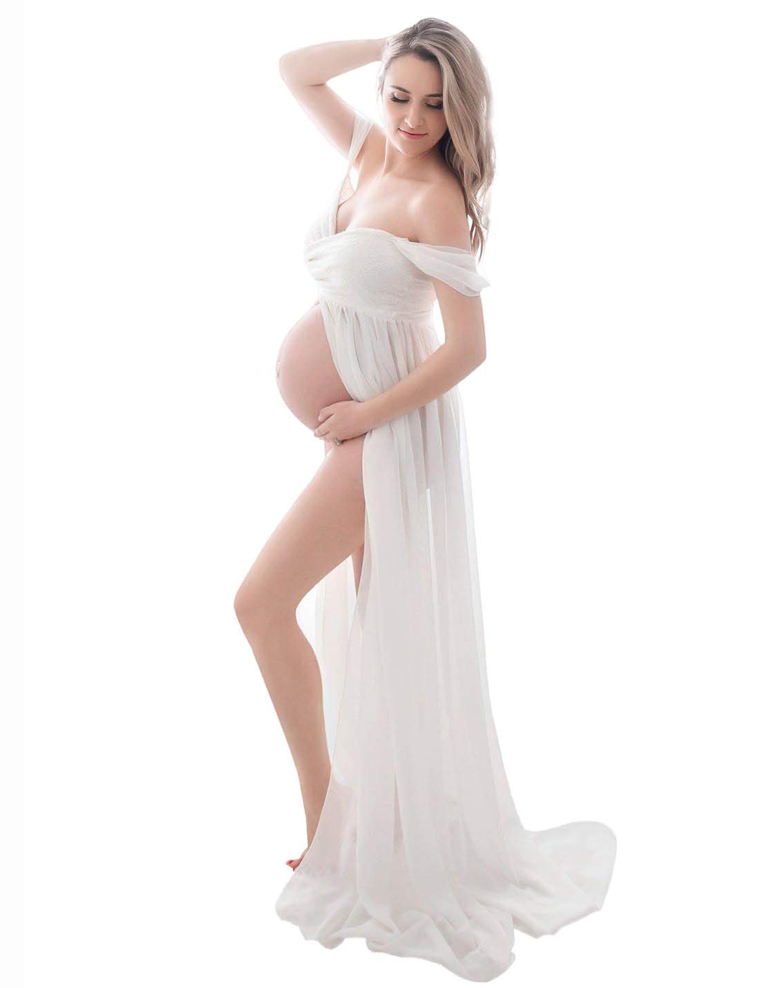 FEOYA Maxi Maternity Dress Chiffon Lace Strapless Gown Split Front for Pregnant Women Photography Full Length White L