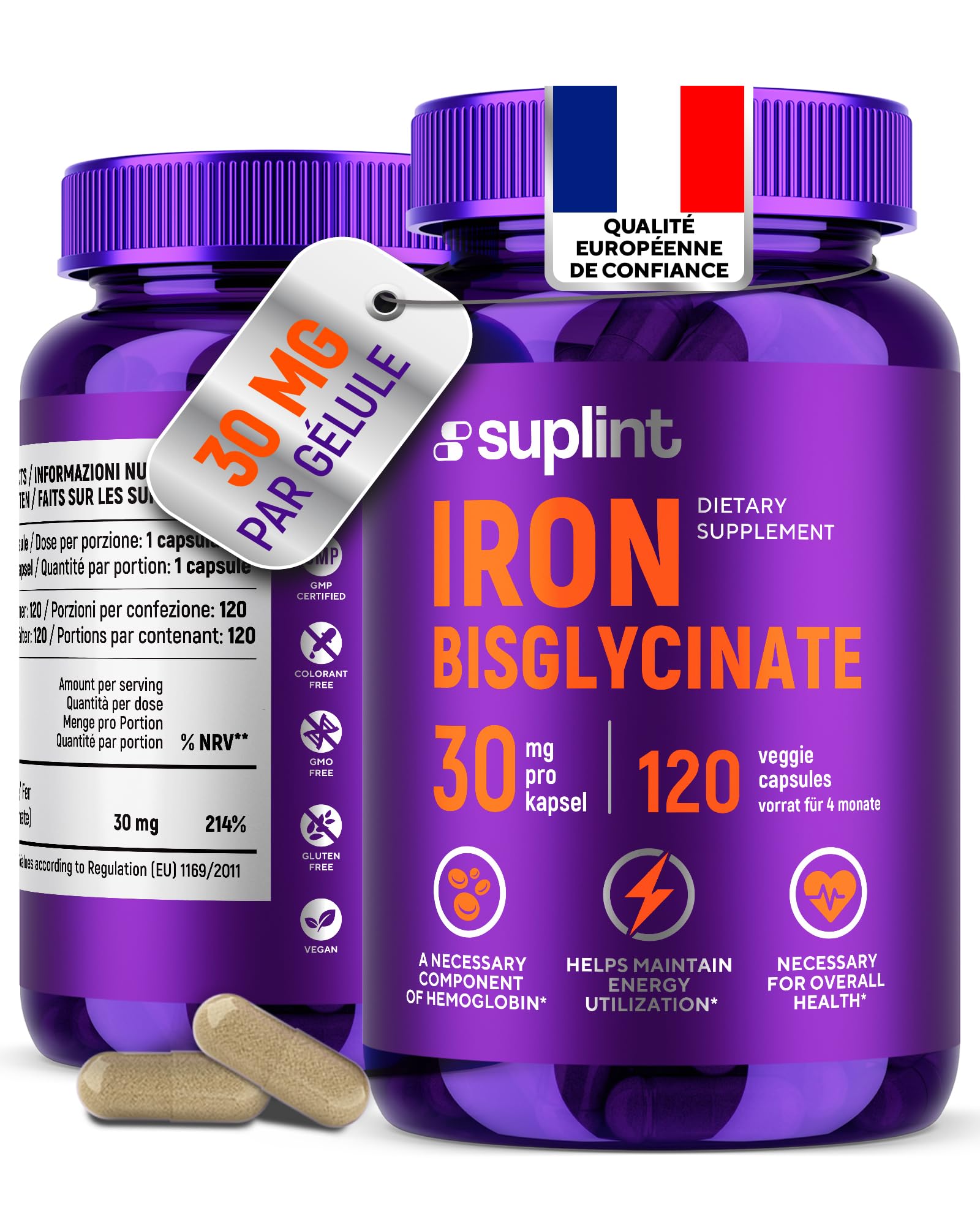 Fer Bisglycinate 30 mg Haute Absorption & Formule Douce 120 G lules V ganes D velopp aux Pays-Bas & Test en Laboratoire de l UE Fer Compl ment Alimentaire Premium (1 Pack)