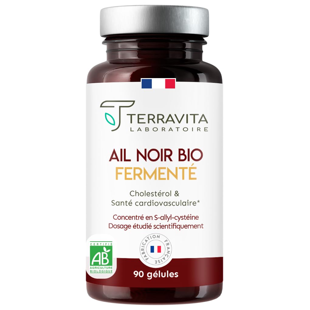 ✓ CUSTOMER SERVICE AVAILABLE Our Organic Fermented Black Garlic is made in France. Your satisfaction is our priority. Do not hesitate to contact us, our team of nutritionists and experts will be happy to offer you personalized assistance. Suitable for a vegetarian diet. AN ALLY AGAINST THE SIGNS OF AGING Rich in antioxidants, it neutralizes free radicals, responsible for cellular aging. By protecting cells from oxidative stress, it slows down the signs of aging, such as wrinkles and loss of skin elasticity. In addition, its anti-inflammatory properties promote better overall health, contributing to healthier aging. CARDIOVASCULAR HEALTH Organic fermented black garlic extract is known for its benefits on cardiovascular health. Thanks to its richness in antioxidants, it helps protect heart cells against oxidative damage. It also helps reduce blood lipids (LDL) by limiting their accumulation in the arteries, which prevents atherosclerosis. In addition, it helps lower blood pressure, thus contributing to better overall heart health. EXTRACT VS POWDER Not all black garlic supplements are equal. Unlike simple black garlic powder, which is less expensive to produce, our capsules contain an extract standardized in S-Allyl-Cysteine, the active ingredient behind the benefits of Black Garlic. This guarantees you a stable SAC concentration in the finished product for optimal effectiveness. ORGANIC AND FERMENTED EXTRACT Black garlic is obtained by specific maturation of white garlic. The result is a finished product without taste or odor, very rich in s-allyl-cysteine, which is beneficial for cardiovascular health and effectively fights blood lipids. More stable and digestible, it has 10x more antioxidant molecules than fresh garlic.✓ SERVICE CLIENT DISPONIBLE Notre Ail Noir Fermenté BIO est fabriqué en France. Votre satisfaction est notre priorité. N'hésitez-pas à nous contacter, notre équipe de nutritionnistes et d'experts se fera un plaisir de vous offrir une assistance personnalisée. Convient à un régime alimentaire végétarien. UN ALLIÉ CONTRE LES SIGNES DE L'AGE Riche en antioxydants, il neutralise les radicaux libres, responsables du vieillissement cellulaire. En protégeant les cellules du stress oxydatif, il ralentit les signes de l'âge, tels que les rides et la perte d'élasticité de la peau. De plus, ses propriétés anti-inflammatoires favorisent une meilleure santé globale, contribuant à un vieillissement en meilleure forme. SANTÉ CARDIOVASCULAIRE L'extrait d'ail noir bio fermenté est reconnu pour ses bienfaits sur la santé cardiovasculaire. Grâce à sa richesse en antioxydants, il favorise la protection des cellules cardiaques contre les dommages oxydatifs. Il aide également à réduire les lipides sanguins (LDL) en limitant leur accumulation dans les artères, ce qui prévient l'athérosclérose. De plus, il aide à diminuer la pression artérielle, contribuant ainsi à une meilleure santé cardiaque globale. EXTRAIT VS POUDRE Tous les compléments d'ail noir ne se valent pas. Contrairement à une simple poudre d'ail noir, moins couteuse à produire, nos gélules contiennent un extrait standardisé en S-Allyl-Cystéine, le principe actif à l'origine des bienfaits de l'Ail Noir. Ceci vous garantit d'avoir une concentration en SAC stable dans le produit fini pour une efficacité optimale. EXTRAIT BIO ET FERMENTE L'ail noir est obtenu par maturation spécifique de l'ail blanc. Il en résulte un produit fini sans goût ni odeur, très riche en s-allyl-cystéine, qui est bénéfique pour la santé cardiovasculaire et lutte efficacement contre les lipides sanguins. Plus stable et digeste, il possède 10x plus de molécules antioxydantes que l'ail frais.