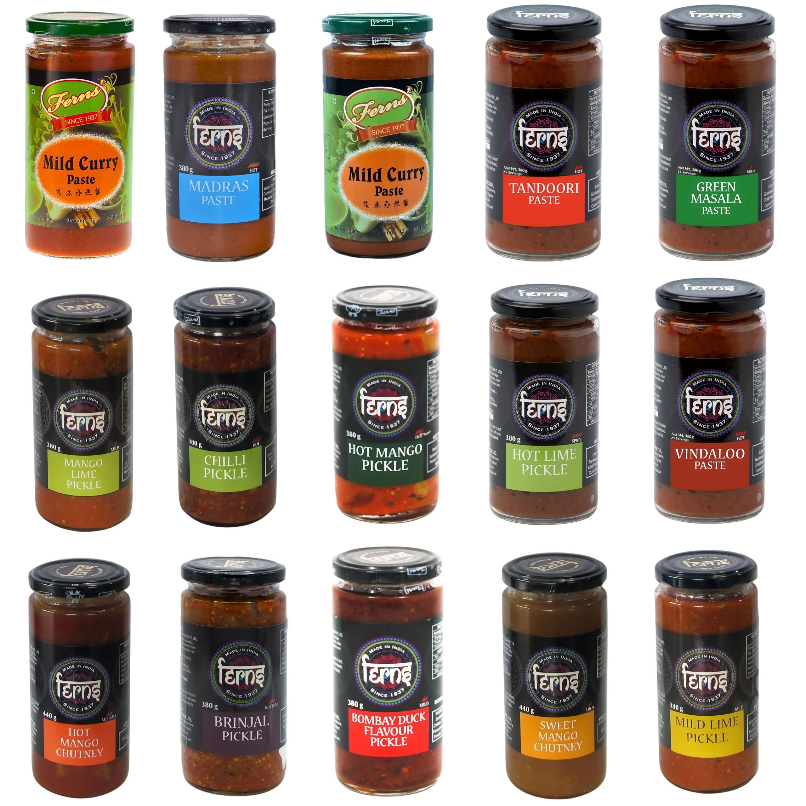 Fern Pickle Curry Sauce Chutney Pick N Mix | Choose From 17+ Flavours |Hot Curry Paste Vindaloo Curry Hot Mango Pickle Hot Lime Pickle Mild Lime Pickle Chilli Pickle - Pack of 6