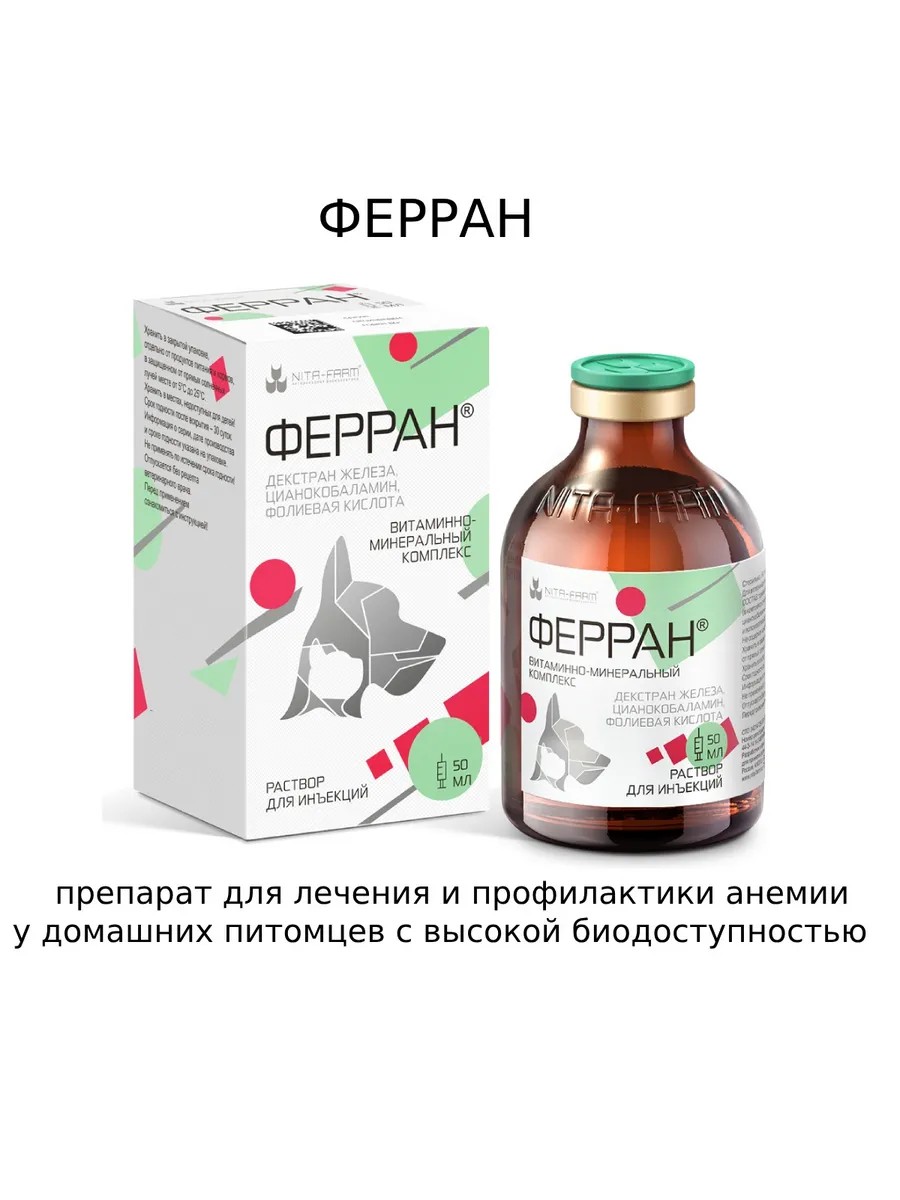 Ферран относится к фармакотерапевтической группе препаратов, влияющих на кроветворение и кровь. Ферран - железо-витаминный комплекс, активизирующий процессы кроветворения и окислительно-восстановительные реакции, способствующий повышению общей резистентности организма.В 1 мл Феррана содержится в качестве действующих веществ 100,0 мг железа (III) (в комплексе с декстраном), 0,005 мг витамина В12, 0,2 мг фолиевой кислоты В9, 20 мг никотиновой кислоты РР, вода для инъекций. При парентеральном введении восполняет в организме недостаток железа, фолиевой кислоты (витамина В9) и цианокобаламина (витамина В12), вызванный экологическими причинами, потерей крови, погрешностями в кормлении или заболеваниями животных. Показания к применению: лечение и профилактика анемии (постгеморрагической, гемолитической, гипопластической, апластической, алиментарной) у молодняка крупного и мелкого рогатого скота, свиней, жеребят, пушных зверей и собак. Запрещается применение животным: с гиперчувствительностью к железодекстрановому комплексу; — с анемиями не связанными с дефицитом железа (сидеробластная анемия, отравление свинцом); с избытком железа в организме и нарушением утилизации железа; с аллергическими заболеваниями кожи; с острым гломерулонефритом; при выраженных нарушениях в печени (гепатитах) и почках (гломерулонефрит, пиелонефрит); при остром недостатке витамина Е.Препарат вводят животным в/м в область бедра или шеи. При проведении инъекции кожу следует сместить в сторону, для предотвращения стекания лекарственного средства. При применении Феррана в зимнее время года перед использованием препарат подогревают на водяной бане до 36-39°С.