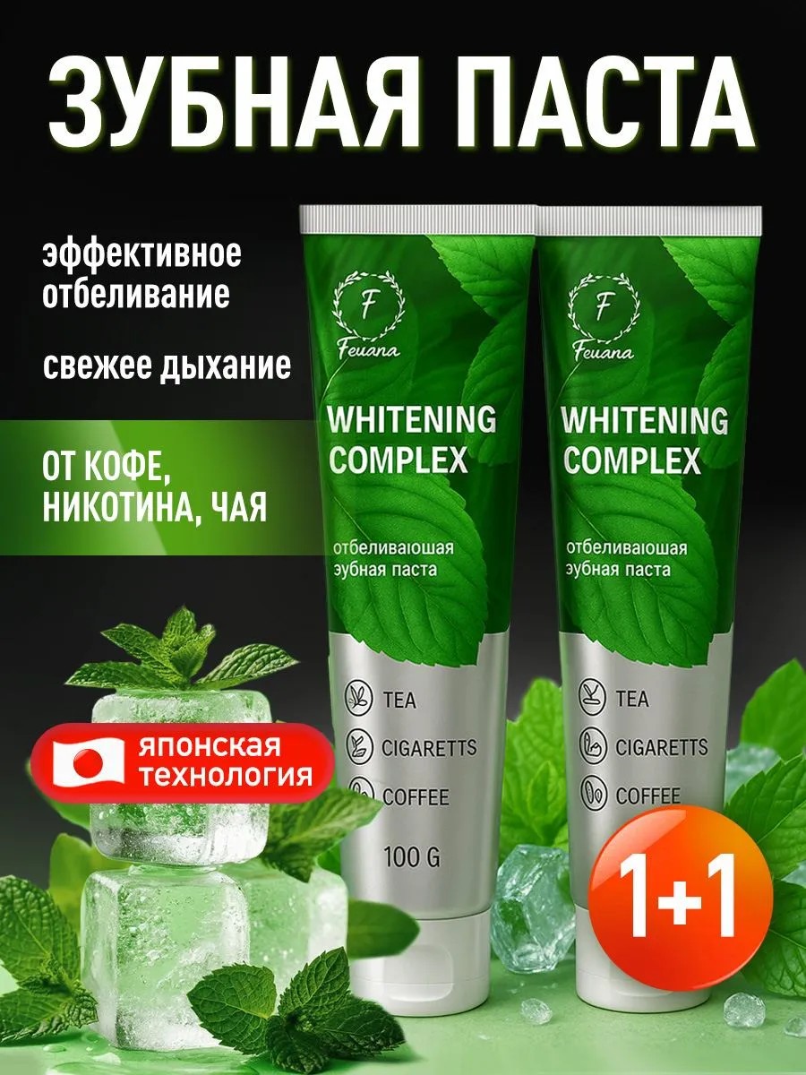 Whitening Complex toothpaste with adaptive intelligence is a must-have for daily dental and oral care! This innovative product from Ferrana provides proven gentle enamel whitening from tea, coffee, and nicotine. It neutralizes unpleasant odors, including tobacco odor. The natural formula includes a nano-sized hydroxyapatite complex, structurally similar to enamel. This unique ingredient promotes strengthening, remineralization, and restoration of teeth. It also contains the natural whitening component xylitol, which prevents the formation of plaque and tartar. It whitens and eliminates smoking odor. This mint-flavored toothpaste has an antibacterial and strengthening effect. It helps maintain the health of the natural microflora of the oral mucosa. The professional, fast-acting formula will ensure fresh breath, whiter and more beautiful teeth, and protection against cavities and bleeding gums. This unique toothpaste formula was developed in Japan and is widely used worldwide. It comes in a convenient tube, perfect for travel. Its beneficial cleansing and refreshing complex with a restorative and protective effect is suitable for people with braces and crowns. High-quality and effective products from Ferrana are a popular choice for removing plaque, whitening, cleaning, and strengthening tooth enamel. They are ideal for use at home and on the go. This care and therapeutic toothpaste is suitable for adults and children aged 12 and up. The deep-cleansing formula can be used for both men and women. The brand's line includes sets of two toothpastes with different nanocomplexes, including whitening formulas for sensitive teeth, formulations that protect against cavities, and those that repair microcracks in tooth enamel. These toothpastes are suitable for both men and women, girls and boys. We have promotions and sales, you can buy our products as gifts at a discount!