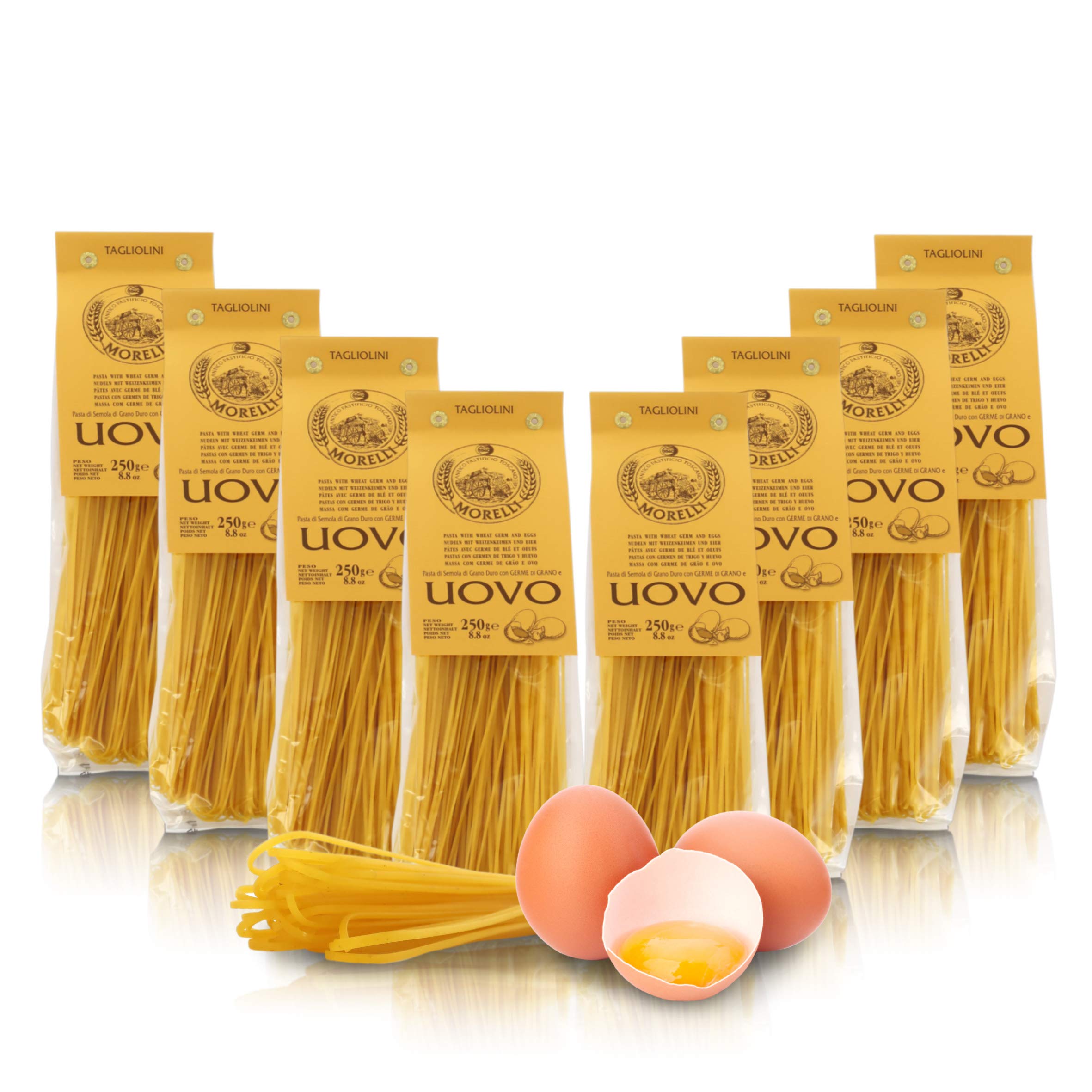 Tagliolini egg clay with wheat germ, 8 x 250 grams Ingredients: durum wheatgrass, water. Allergens: contains gluten-containing grains. Made in the factory that also uses egg, fish and plasticizer products. Storage conditions: dry and away from grains. The Morelli Pasta is prepared by hand in a family-run pastificie in the province of Pisa, founded in 1860. For 5 generations, the pasta has been prepared with high-quality durum wheat bones and classic techniques that include bronze drying and low-temperature drying with full attention to tradition. The flower flour of the Morelli production is the wheat germ pasta, which uses a natural ingredient, which is normally removed, which, through the artisanal processing, on the other hand, allows a new introduction into the dough and gives the pasta a very special taste and aroma. The Morelli noodle series includes: wheat germ pasta, regional types, egg dough and wheat germ, Toscana whole wheat pasta, senator caps, hull pasta, gluten-free pasta, anti-grain and kamut flavor, multi-colored and gift items.? Morelli Pastai Masters use wheat germ and the finest bones. The old Pastificio Morelli was founded in 1860 and is still family owned after 5 generations ? . Contents: 8 pieces net weight: 2 kg cooking time: 5 minutes. Prepared by hand, it belongs to the line "Pasta a egg with wheat germ". Pasta, made in Tuscany, "Tagliolini" format.Antico Pastificio Morelli 1860 Srl Tagliolini, eierpasta en tarwekiemen, 8 verpakkingen à 250 g Tagliolini eiklei met tarwekiemen, 8 x 250 gram Ingrediënten: hard tarwegras, water. Allergenen: bevat glutenhoudende granen. Gemaakt in de fabriek, die ook eier-, vis- en weekmaker producten gebruikt. Opslagomstandigheden: droog en uit de buurt van granen. De Morelli Pasta wordt met de hand bereid in een gezinsbeheerde pastificie in de provincie Pisa, die in 1860 is opgericht. Al 5 generaties wordt de pasta bereid met hoogwaardige graten van harde tarwe en klassieke technieken die bronzen drogen en drogen bij lage temperatuur met volledige aandacht voor de traditie zijn. De bloemenbloem van de productie Morelli is de tarwekiempasta, die een natuurlijk ingrediënt gebruikt, dat normaal gesproken wordt verwijderd, dat door de ambachtelijke verwerking daarentegen een nieuwe introductie in het deeg mogelijk maakt en de pasta een heel bijzondere smaak en aroma geeft. De Morelli-noedelserie omvat: tarwekiempasta, regionale typen, eierdeeg en tarwekiemen, Toscana volkorenpasta, senatorpetten, hullpasta, glutenvrije pasta, antikorrels en kamutsmaak, meerkleurig en geschenkartikelen.? Morelli Pastai Masters gebruiken tarwekiemen en de fijnste graatjes. De oude Pastificio Morelli werd in 1860 opgericht en is na 5 generaties nog in familieeigendom ? . Inhoud: 8 stuks nettogewicht: 2 kg kooktijd: 5 minuten. Met de hand bereid, behoort tot de lijn "Pasta a ei met tarwekiemen". Pasta, gemaakt in Toscane, formaat "Tagliolini".