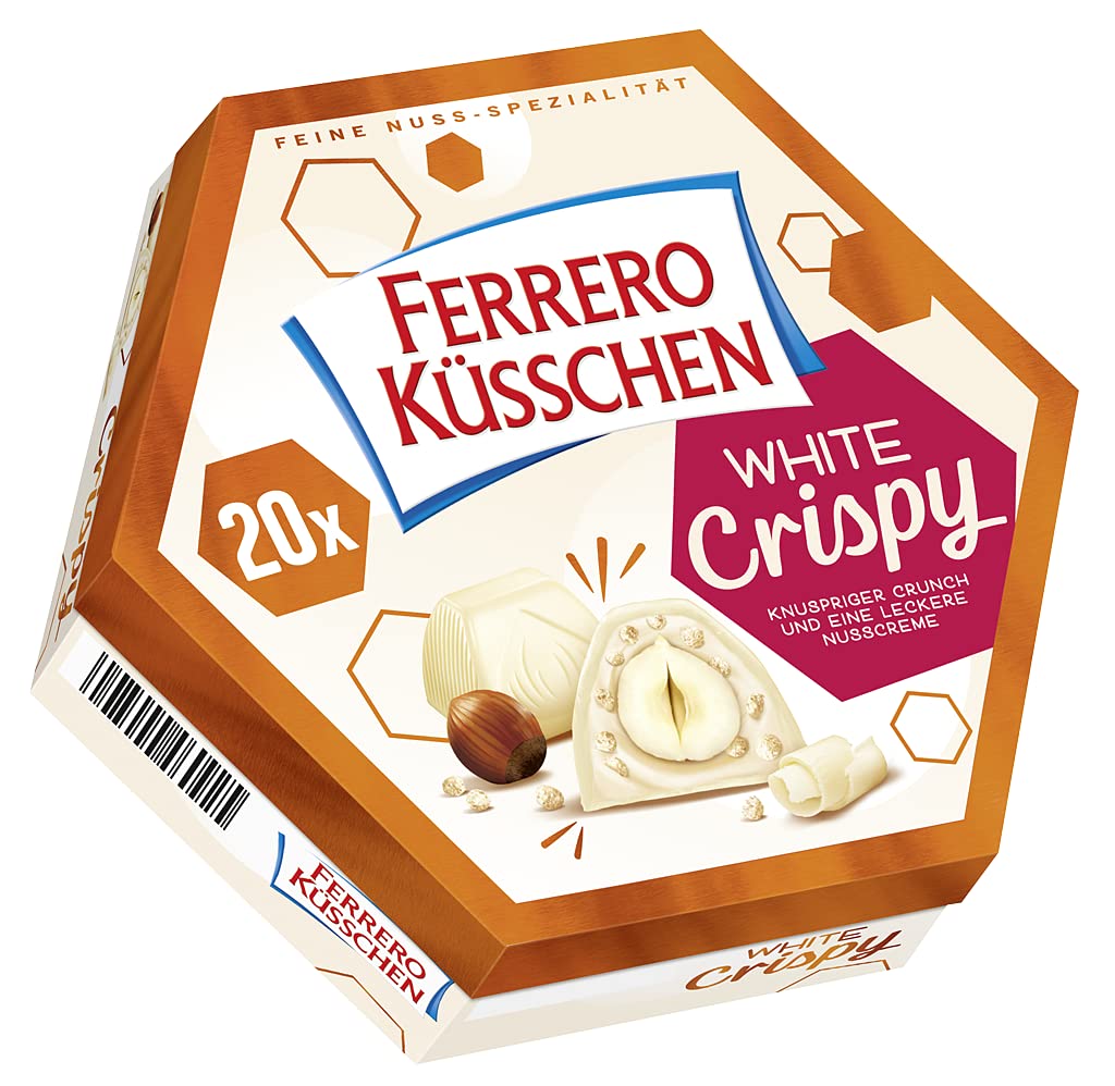 A crispy hazelnut in a light cream with crispy crispies coated in fine white chocolate – that's Ferrero Kissen White Cream. Ferrero Kisses are perfect for sharing and enjoying with your friends – because you give a kiss. INGREDIENTS Ingredients: White chocolate 46.5 (cocoa butter, sugar, skimmed milk powder, fat Butter, emulsifier lecithin (SOY) vanillin), octopus nuts (19.5 ), sugar, palm oil, skimmed milk powder, rice flour, white milk, raising powder, sodium bicarbonate, sunflower oil, emulsifier lecithin (SOY) flavorings, salt. May contain gluten and almonds.The little gesture for friends – because good friends give you a kiss. Perfect for sharing and enjoying with friends, as a gift or for making yourself. The little gesture for friends – because good friends give you a kiss. Contents per pack of 20 pieces – individually wrapped. Crispy crispies and a delicious nut cream – Try it now!. Ferrero Bisous White Crispy – Enjoy white chocolate with crispy crispies! Une noisette croustillante dans une crème claire avec des crispies croustillantes enrobées de chocolat blanc fin – c'est la crème blanche Ferrero Kissen. Les bisous Ferrero sont parfaits pour partager et profiter avec vos amis – car on donne un bisou. INGRÉDIENTS Ingrédients: Chocolat blanc 46,5 (beurre de cacao, sucre, lait écrémé en poudre, graisse Beurre, lécithine émulsifiante (SOJA) vanilline), noix de poulpe (19,5 ), sucre, huile de palme, lait écrémé en poudre, farine de riz, blanc lait, poudre de levage, hydrocarbures de sodium Gencarbonate, tournesol. huile, émulsifiant lécithine (SOJA) arômes, sel. Peut contenir des glutens et des amandes.Le petit geste pour les amis – parce que de bons amis vous donne un baiser. Parfait pour partager et profiter avec des amis, pour offrir ou faire soi-même. Le petit geste pour les amis – parce que de bons amis vous donne un baiser. Contenu par paquet de 20 pièces – emballé individuellement. Crispies croustillantes et une délicieuse crème aux noix – Essayez maintenant!. Ferrero Bisous White Crispy – Savourez du chocolat blanc avec des crispies croustillantes!.