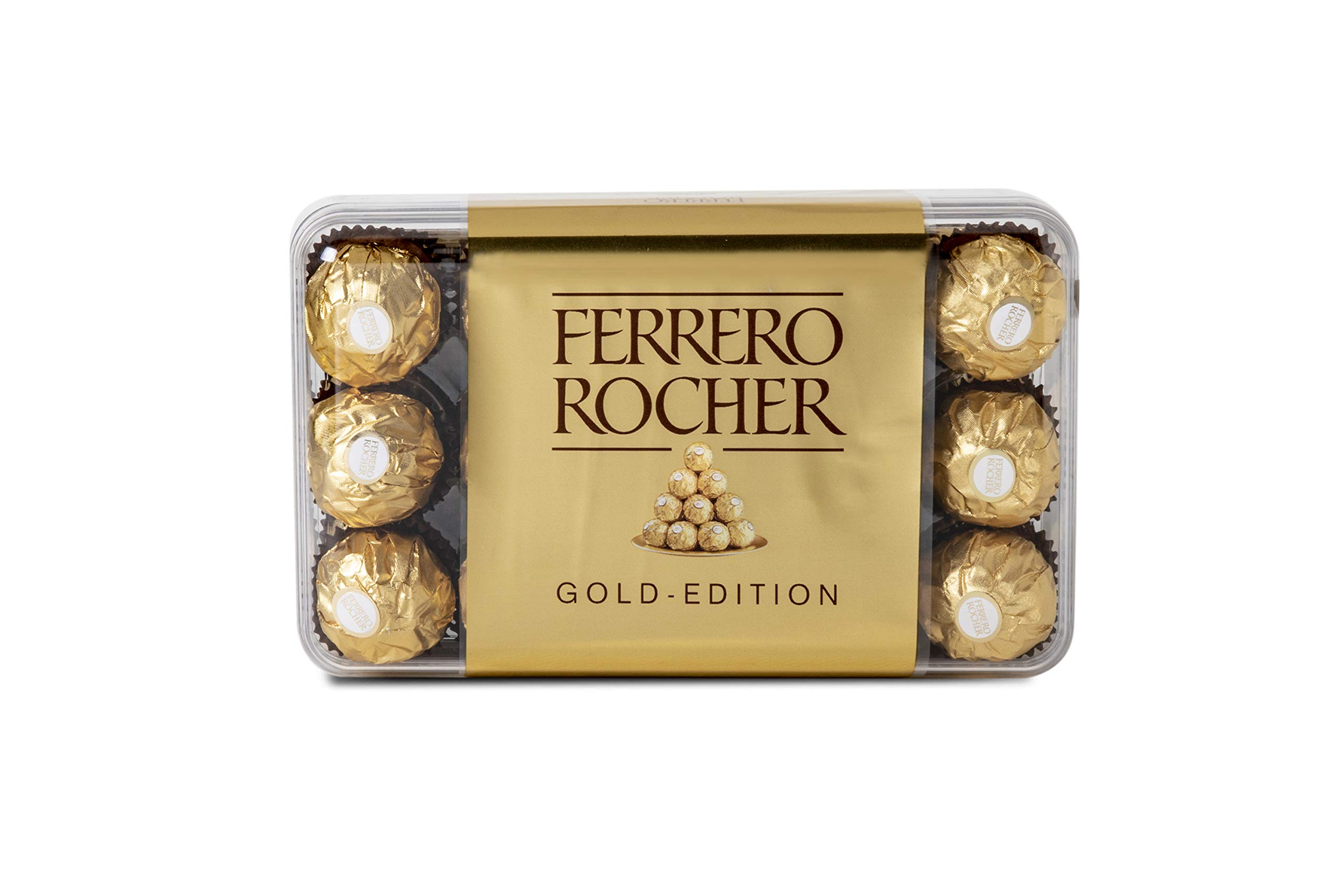FERRERO ROCHER - A crispy wafer covered in chocolate with hazelnut grains and filled FERRERO ROCHER - The joy of being with family, special affection, true friendship, time spent with loved ones: Ferrero Rocher brightens up festive moments FERRERO - Knowing how to combine tradition and innovation are two elements that have distinguished us for over 70 years. For Ferrero, quality has always been the priority and it is materialized every day in the choice of the best raw materials, in the manufacturing of the best products, in the use of the most technological production and distribution processes and in the constant and punctual controls that we carry out throughout our supply chain. For us at Ferrero, quality is the purest form of respect for our consumers. INGREDIENTS Ingredients: Milk chocolate 30 (sugar, cocoa butter, cocoa mass, skimmed milk powder, concentrated butter, emulsifiers: lecithins (soy), vanillin), hazelnuts (28.5 ), sugar, palm butter, wheat flour, whey powder, defatted cocoa, emulsifiers: lecithins (soy), raising agent (sodium hydrogen carbonate), salt, vanillin. DIRECTIONS FOR USE Store dry and away from heat DISCLAIMER Non-contractual photography. The above indications are given for information purposes. They are not necessarily exhaustive and cannot replace the information appearing on the product packaging which alone is authentic, and to which you are invited to refer, particularly in the event of food intolerance. DID YOU KNOW THAT - In summer, you cannot find Ferrero Specialties because we withdraw them from the points of sale. Heat, the enemy of chocolate, could harm the quality of our products. FORMAT - An elegant and practical box, ideal for a refined gift: it allows you to preserve the product to enjoy it at its best. INGREDIENTS - milk chocolate 30 , hazelnuts (28.5 ). FERRERO ROCHER - The joy of being with family, a special affection, true friendship, time spent with loved ones: Ferrero Rocher brightens up festive moments. FERRERO ROCHER - A crispy wafer covered in chocolate with hazelnut grains and a filling. FERRERO ROCHER - Une gaufrette croustillante recouverte de chocolat aux grains de noisettes et fourrée FERRERO ROCHER - La joie d'être en famille, une affection particulière, une véritable amitié, du temps passé avec des proches : Ferrero Rocher illumine les moments de fête FERRERO - Savoir allier tradition et innovation sont deux éléments qui nous distinguent depuis plus de 70 ans. Pour Ferrero, la qualité a toujours été la priorité et elle se concrétise chaque jour dans le choix des meilleures matières premières, dans la fabrication des meilleurs produits, dans l'utilisation des processus de production et de distribution les plus technologiques et dans les contrôles constants et ponctuels que nous effectuons tout au long de notre chaîne d'approvisionnement. Pour nous, chez Ferrero, la qualité est la forme la plus pure de respect pour nos consommateurs. INGRÉDIENTS Ingrédients: Chocolat au lait 30 (sucre, beurre de cacao, pâte de cacao, lait écrémé en poudre, beurre concentré, émulsifiants : lécithines (soja), vanilline), noisettes (28,5 ), sucre, beurre de palme, farine de blé, lactosérum en poudre, cacao dégraissé, émulsifiants : lécithines (soja), poudre à lever (carbonate acide de sodium), sel, vanilline. MODE D'EMPLOI A conserver au sec et à l'abri de la chaleur CLAUSE DE NON-GARANTIE Photographie non contractuelle. Les indications ci-dessus sont données à titre d'information. Elles ne sont pas forcément exhaustives et ne sauraient se substituer aux informations figurant sur l'emballage du produit qui font seules foi, et auxquelles vous êtes invités à vous reporter, notamment en cas d'intolérance alimentaire. SAVIEZ-VOUS QUE - En été, vous ne pouvez pas trouver les Spécialités Ferrero car nous les retirons des points de vente. La chaleur, ennemie du chocolat, pourrait nuire à la qualité de nos produits. FORMAT - Une boîte élégante et pratique, idéale pour un cadeau raffiné : elle permet de conserver le produit pour en profiter au mieux. INGRÉDIENTS - chocolat au lait 30 , noisettes (28,5 ). FERRERO ROCHER - La joie d'être en famille, une affection particulière, une véritable amitié, du temps passé avec des proches : Ferrero Rocher illumine les moments de fête. FERRERO ROCHER - Une gaufrette croustillante recouverte de chocolat avec des grains de noisettes et un fourrage.