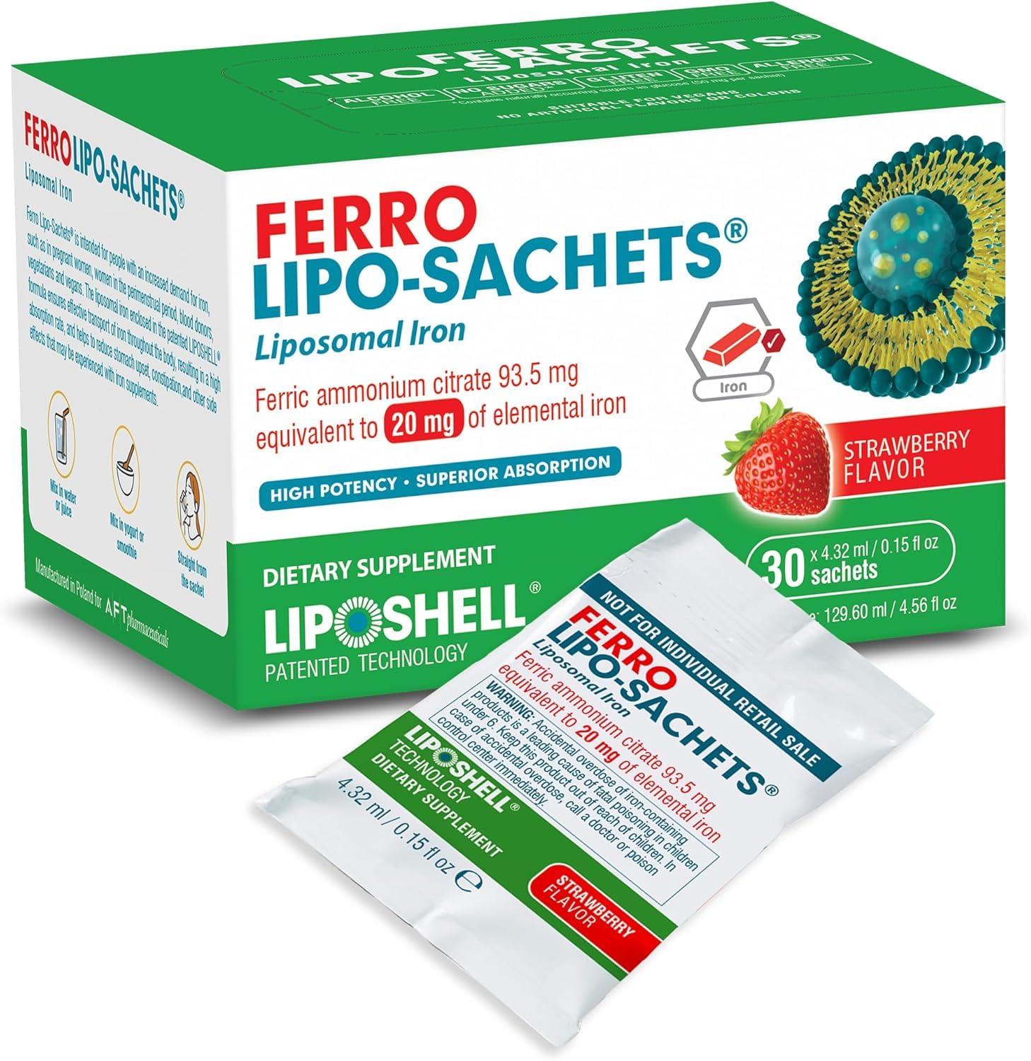 EASY TO TAKE IRON, ANYWHERE, ANYTIME: Simply squeeze the contents of one packet to a small amount of cold still water or juice and drink in one gulp. Lipo-Sachets iron is alcohol free, dairy free, gluten free, vegan and contains no added sugar. NATURAL STRAWBERRY FLAVOR: Our iron gel supplement has a natural strawberry flavor with no artificial additives, flavors or sweeteners. EASY ON THE STOMACH: Using Liposomal iron helps to reduce stomach upset, constipation other unpleasant gastrointestinal side effects that are often associated with iron supplements. IRON SUPPLEMENTS FOR ENERGY, FATIGUE AND IMMUNE SUPPORT: Liposomal liquid gel iron supplements are great for adults needing help with feeling tired, experiencing fatigue, lacking in energy, and looking to maintain healthy iron levels, vitality, and overall well-being. HIGH ABSORPTION LIPOSOMAL LIQUID IRON: Lipo-Sachets Liposomal Iron Gel packets utilize patented Liposhell technology to transport iron to where your body needs it most by encapsulating and protecting the iron from degradation in the digestive system.