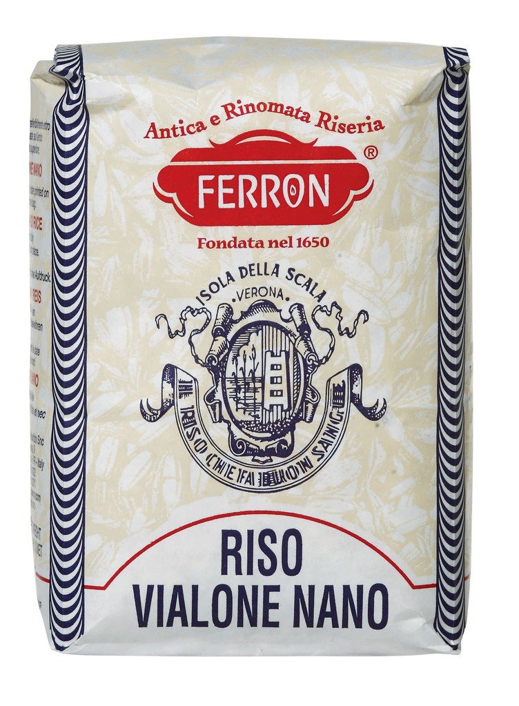 Vialone Nano is one of the four most important rice varieties in Italy. This rice comes from the town of Isola della Scala, near Verona, which is renowned for rice cultivation. The beautiful, round, white-gray grains have a high starch content and are tasty, with a nutty accent. Vialone Nano is ideal for creamy risotti and lighter rice salads. Ingredients: round grain rice. Ingredients: rice. Store cool and dry. Packaged under a protective atmosphere. Made in Italy. Nutritional values per 100 g 100 ml: energy value: 331 kcal 1389 kJ, fat: 0.4 g, of which saturated fatty acids: 0.1 g, carbohydrates: 80.4 g, of which sugar: 0.2 g, proteins: 6.7 g, salt: 0.01 g INGREDIENTS Round grain rice. Ingredients: rice. Store cool and dry. Packaged under a protective atmosphere. Made in Italy.Ferron Risotto Rijst 500g Vialone Nano is een van de vier belangrijkste rijstsoorten van Italië. Deze rijst komt uit de plaats Isola della Scala, bij Verona, die gerenommeerd is voor de rijstteelt. De mooie, ronde, witgrijze korrels hebben een hoog zetmeel en zijn smaakvol, met een nootachtig accent. Vialone Nano is ideaal voor romige risotti en lichtere rijstsalades. Ingrediënten: rondkorrelige rijst. Ingrediënten: rijst. Koel en droog bewaren. Verpakt onder beschermende atmosfeer. Gemaakt in Italië. Voedingswaarden per 100 g 100 ml: energetische waarde: 331 kcal 1389 kJ, vet: 0,4 g, waarvan verzadigde vetzuren: 0,1 g, koolhydraten: 80,4 g, waarvan suiker: 0,2 g, eiwitten: 6,7 g, zout: 0,01 g INGREDIËNTEN Rondkorrelige rijst. Ingrediënten: rijst. Koel en droog bewaren. Verpakt onder beschermende atmosfeer. Gemaakt in Italië.