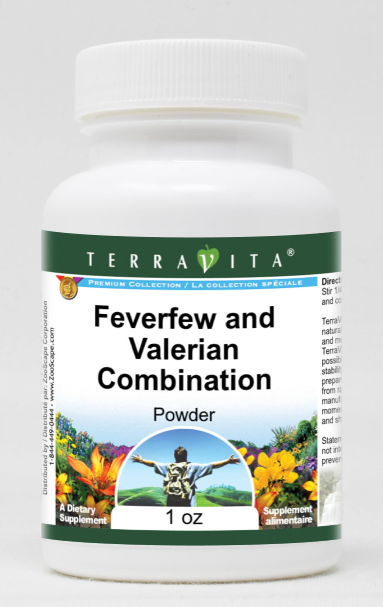Convenient Powder format. Size: 1 oz. Manufacturer: TerraVita. No fillers. Feverfew and Valerian Combination Powder (1 oz, ZIN: 516994).