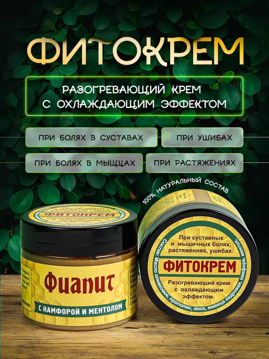 Фитокрем разогревающий с охлажадющим эффектомс камфорой и ментолом отличное средство для снятия боли в суставах, мыщцах при ушибе или растяжении. В состав крема входят: Масло оливковое: благодаря своей структуре является хорошим проводником. Целый комплекс активных компонентов, входящих в состав масла благотворно действует на костную и хрящевую ткань, а также стимулирует выработку синовиальной жидкости.