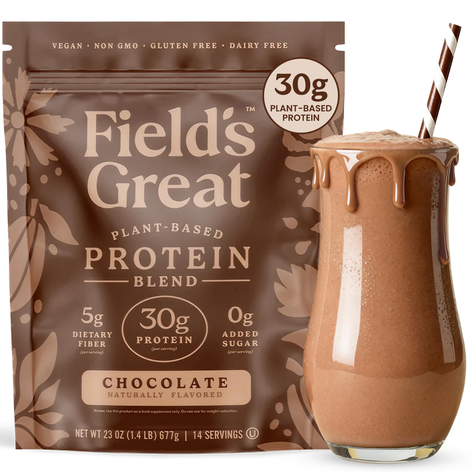 Field's Great All-in-One Plant-Based Chocolate Protein Shake Powder Healthy Aging 30g Protein 5g Fiber + Probiotics Gut-Friendly Blood Sugar & Muscle Support Vegan Meal Replacement GLP1 23oz
