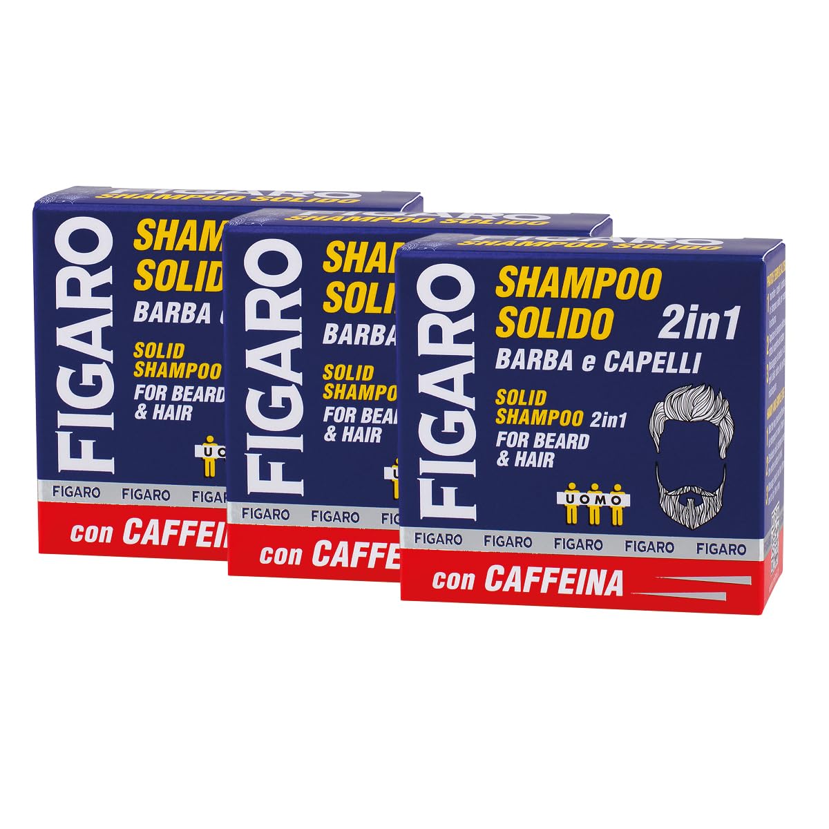 FIGARO - Our 1F solid shampoo with coffee and caffeine extract is suitable for all beard and hair types, leaving hair soft, energized, and pleasant to the touch. Packaged without plastic, it's your step forward in masculine grooming for the good of the planet. The quick-rinse formula lets you turn off the water to reduce consumption. Practical and simple to use: 1. Wet hair, beard, and the solid shampoo to create a lather. 2. Apply the solid shampoo to the entire area to be treated. 3. Massage into beard and hair from root to tip, then rinse. INGREDIENTS Sodium coco-sulfate, sodium chloride, citric acid, oryza sativa starch, glycerin, shorea steoptera seed butter, water, persea gratissima oil, fragrance, betaine, carrageenan, caffeine, coumarin, linalool, coffea arabica seed extract, alpha-isomethyl ionone. SAFETY WARNING For outdoor use only. Avoid contact with eyes. Do not ingest. See moreFigaro Line: New to the Figaro line, the 2-in-1 solid shampoo specifically designed to cleanse beards and hair—your step forward in men's grooming routines for the good of the planet. Sustainable: In plastic-free packaging, your step forward in men's grooming routines for the good of the planet. Quick-rinse formula: turn off the water to reduce consumption. Directions: Wet hair, beard, and the solid shampoo to create a lather. Apply the solid shampoo to the entire area to be treated. Massage into the beard and hair from root to tip, then rinse. Solid Shampoo: Our 1F solid shampoo with coffee and caffeine extract is suitable for all beard and hair types, leaving hair feeling soft, energized, and pleasant to the touch.Figaro Shampooing solide 2 en 1 pour barbe et cheveux avec extrait de café et caféine, action énergisante, sans plastique, 70 g, lot de 3DESCRIPTION DU PRODUIT DESCRIPTION DU PRODUIT FIGARO - Notre shampooing solide 1F avec extrait de café et de caféine, convient à tous les types de barbe et de cheveux, pour un effet doux, énergisant et agréable au toucher. Dans un emballage sans plastique, votre saut vers l'avant dans la gestualité masculine pour le bien de la planète. Formule à rinçage rapide, fermez l'eau pour réduire la consommation. Pratique et simple à utiliser : 1 humidifier les cheveux, la barbe et le shampooing solide pour créer la mousse 2 - Appliquer le shampooing solide sur toute la surface à traiter 3- Masser la barbe et les cheveux de la racine aux pointes, rincer. INGRÉDIENTS sodium coco-sulfate, sodium chloride, citric acid, oryza sativa starch, glycerin, shorea stéoptera seed butter, eau, persea gratissima oil, parfum, betaine, carrageenan, caféine, coumarin, linalool, coffea arabica seed extrait, alpha-isomethyl ionone. AVERTISSEMENT DE SÉCURITÉ Pour une utilisation en extérieur uniquement. Évitez le contact avec les yeux. Ne pas ingérer Voir plusLigne Figaro : nouveauté de la ligne Figaro, le shampooing solide 2 en 1 spécifique pour nettoyer la barbe et les cheveux, votre saut vers l'avant dans la gestualité masculine pour le bien de la planète. Durable : dans un emballage sans plastique, votre saut vers l'avant dans la gestualité masculine pour le bien de la planète. Formule à rinçage rapide, fermez l'eau pour réduire la consommation. Mode d'emploi : humidifier les cheveux, la barbe et le shampooing solide pour créer la mousse. Appliquer le shampooing solide sur toute la surface à traiter. Masser la barbe et les cheveux de la racine aux pointes, rincer. Shampooing solide : notre shampooing solide 1F avec extrait de café et de caféine, convient à tous les types de barbe et de cheveux, pour un effet doux, énergisant et agréable au toucher.