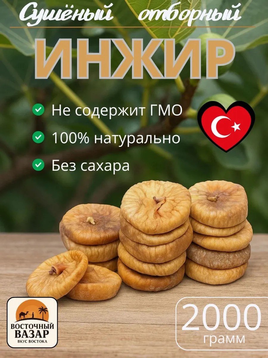 Натуральные, сушеные и целые фиги инжира из Турции 2000 г - это вкусный и полезный продукт, который станет отличным дополнением к вашему рациону. Этот отборный турецкий инжир, выращенный в экологически чистых горных районах. Он тщательно отобран и высушен без добавления сахара, консервантов, ароматизаторов и усилителей вкуса, сохраняя при этом все свои натуральные свойства. Этот полезный сухофрукт инжир станет настоящим лакомством для любителей здорового питания. Богатый витаминами и минералами, он станет отличным источником энергии и полезных веществ. Плоские цельные фиги инжира — лакомство и высокопитательный диетический продукт. Содержит до 18 % сахаров (в основном глюкозу и фруктозу), 5,4 % пектиновых веществ, 6 % белков, 3,1 % жиров, 3,2 мг% железа, органические кислоты (лимонную, яблочную, уксусную), ферменты, витамины (каротин, Вь Вг, РР, С). Благодаря высокому содержанию клетчатки, он способствует улучшению пищеварения и дарит чувство сытости. Инжир очень вкусный и сладкий, но некоторые фиги могут попадаться с небольшой кислинкой, это связано с тем, что при сушке инжир становится кисловатым и приобретает более интенсивный вкус. Это происходит из-за содержания в плодах органических кислот, таких как лимонная, яблочная и уксусная. Нежный и мягкий инжир является традиционным ингредиент десертов и выпечки, его можно добавлять в мясные блюда, салаты или приготовить компот, взвар, а также фруктовые коктейли. Он станет отличным выбором для тех, кто заботится о своем здоровье и ищет вкусные и полезные альтернативы сладостям. Наслаждайтесь натуральным вкусом и ароматом каждого кусочка этого горного инжира без сахара!