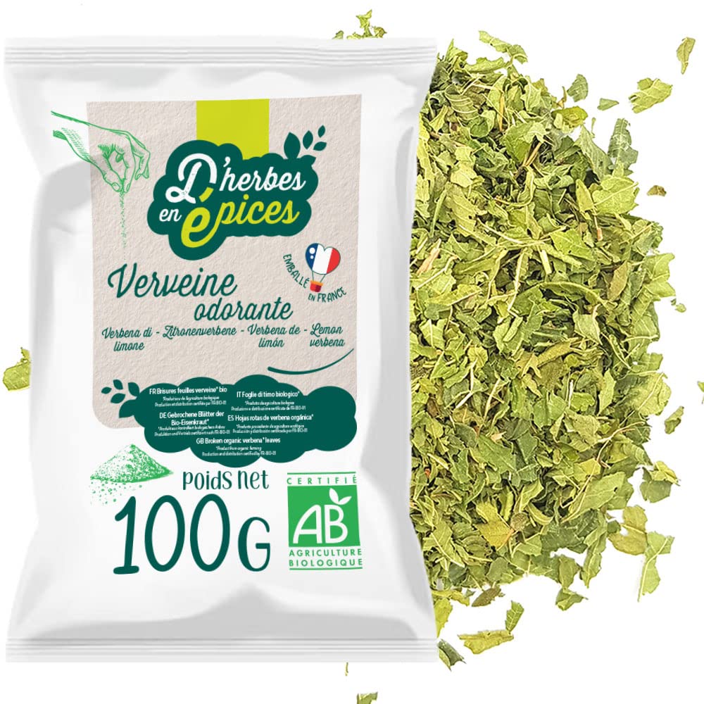 Very different from official verbena, fragrant verbena is much more fragrant. Grown in South America, North Africa or Provence. The numerous twigs bear elongated deciduous leaves with a beautiful, bright green to light gold color. Very aromatic, sweet and lemony taste, the plants are finely chopped. Verbena is used to sleep better, reduce tension, fatigue and irritability. Our infusion is designed to meet your expectations without forgetting your taste pleasure thanks to pleasant flavors. Infusion advice Steep in a cup of boiling water for 5 to 7 minutes. Recommended daily dose: 2 cups per day, or 2.4 g of verbena leaf Disclaimer: This infusion is not a medicine. Consume as part of a varied and balanced diet and a healthy lifestyle. Do not exceed the daily dose. Keep out of the reach of young children. Ingredients: Verbena leaf Product of organic farming INGREDIENTS Organic verbena INSTRUCTIONS FOR USE Steep in a cup of boiling water for 5 to 7 minutes SAFETY WARNING This infusion is not a medicine. Consumption as part of a varied and balanced diet and a healthy lifestyle. Do not exceed the daily dose. Keep out of the reach of small children. See moreD'HERBES EN EPICES Biologische Verbena Gebroken 100g Bulk kruidenthee en infusie Gecertificeerde biologische Heel anders dan officiële verbena, geurige verbena is veel geuriger. Gekweekt in Zuid-Amerika, Noord-Afrika of de Provence. De talrijke twijgen dragen langwerpige bladverliezende bladeren met een mooie, heldergroene tot lichtgouden kleur. Zeer aromatische, zoete en citroenachtige smaak, de planten zijn fijn gesneden. Verbena wordt gebruikt om beter te slapen, spanning, vermoeidheid en prikkelbaarheid te verminderen. Onze infusie is ontworpen om aan uw verwachtingen te voldoen, zonder uw smaakgenot te vergeten dankzij aangename smaken. Infusieadvies Laat 5 tot 7 minuten trekken in een kop kokend water. Aanbevolen dagelijkse dosis: 2 kopjes per dag, of 2,4 g verbenablad Disclaimer: Deze infusie is geen geneesmiddel. Consumeer als onderdeel van een gevarieerde en evenwichtige voeding en een gezonde levensstijl. De dagelijkse dosis niet overschrijden. Buiten bereik van jonge kinderen bewaren. Ingrediënten: Verbenablad Product van biologische landbouw INGREDIËNTEN Biologische verbena GEBRUIKSAANWIJZING 5 tot 7 minuten in een kopje kokend water laten trekken VEILIGHEIDSWAARSCHUWING Deze infusie is geen medicijn. Consumptie als onderdeel van een gevarieerde en evenwichtige voeding en een gezonde levensstijl. Overschrijd de dagelijkse dosis niet. Buiten het bereik van kleine kinderen bewaren. Meer bekijken