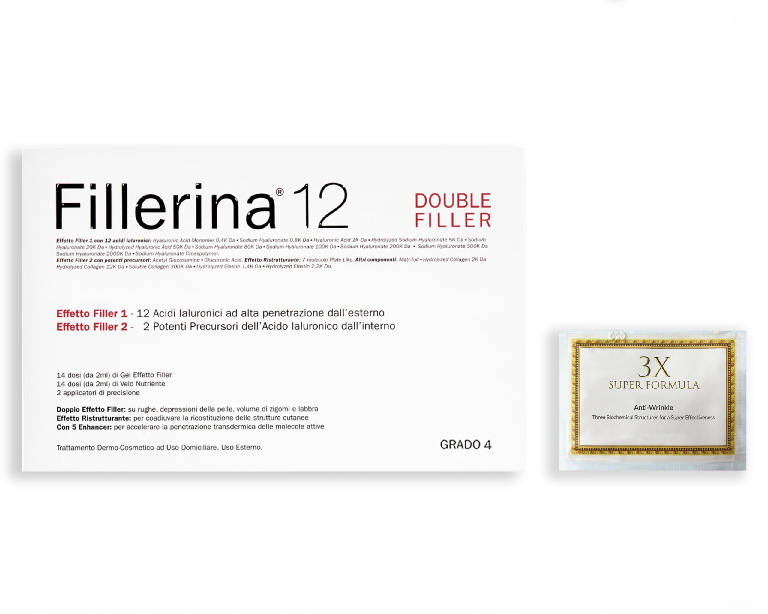 En trois dosages : grade 3, 4 et 5. Usage extérieur. Évitez tout contact avec les yeux. Ne pas avaler. Tenir à l'écart de la chaleur. Double effet de remplissage avec 12 acides hyaluroniques à poids moléculaires différenciés et 2 précurseurs de l'acide hyaluronique. Effet restructurant avec 7 molécules Plate-Like. 5 Enhancer pour accélérer la pénétration transdermique des molécules actives. Fillerina 12 Double Filler Crème Nuit est un traitement quotidien à double effet de remplissage sur toutes les zones du visage. Nourrissant et réparateur, à utiliser seul ou en association avec d'autres préparations Fillerina. Mode d'emploi : Appliquer le soir sur le visage et le cou propres en faisant absorber avec un léger massage. Fillerina 12 Double Filler Crème Jour est un traitement quotidien à double effet de remplissage sur toutes les zones du visage. Hydratant et protecteur, à utiliser seul ou en association avec d'autres préparations Fillerina. SPF 15 Mode d'emploi : appliquer le matin sur le visage et le cou propres en faisant absorber avec un léger massage.