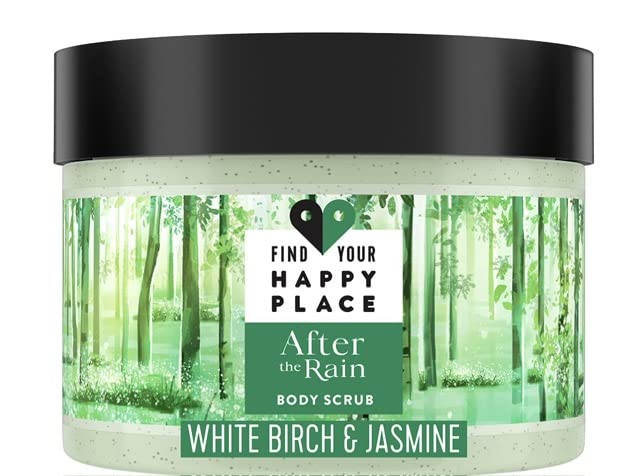 Reconnect with nature with Find Your Happy Place Body Scrub After The Rain 10 oz. Scented with notes of blooming jasmine, white birch, cucumber water and crisp green tea, this body scrub buffs away dry, dull skin for a smooth and radiant glow. To use, simply scoop a small amount of the scrub into your hands and gently massage onto your skin in circular motions, then rinse.