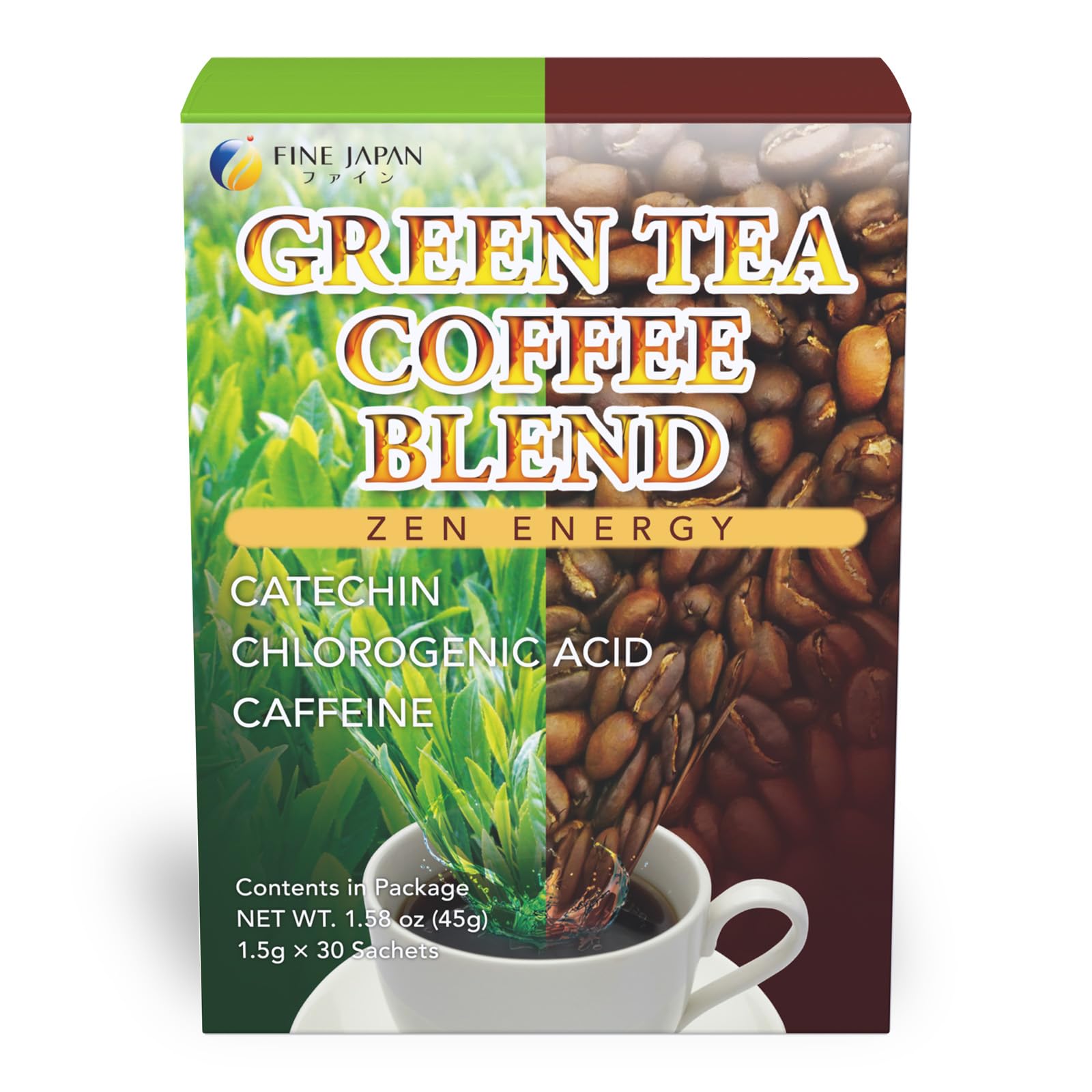 FINE JAPAN Green Tea and Coffee Blend Powder/Catechins and Chlorogenic Acid/Made in Japan/ 30 Sticks (45g) 1