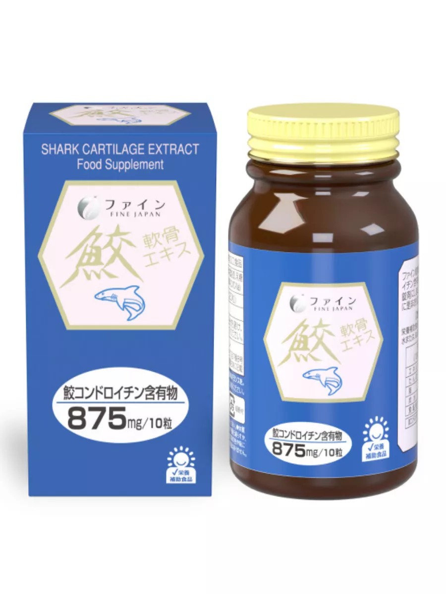 Fine Lab Shark Cartilage Tablets. Shark cartilage tablets (520 tablets). Shark cartilage is the basis of the shark skeleton, a unique natural substance with a wide range of health benefits. Scientists have managed to transform shark cartilage into an easily digestible form while preserving and enhancing its beneficial properties. As a result, we have an excellent opportunity to support our bodies with the supplement "Shark Cartilage Tablets." Shark cartilage is a rich source of chondroitin and glucosamine, collagen, hyaluronic acid, mucopolysaccharide, calcium, phosphorus, and vitamins. Hyaluronic acid promotes fluid retention in cartilage tissue, making it flexible and ligaments elastic. Hyaluronic acid is widely known for its ability to leave skin hydrated, fresh, and smooth. Chondroitin and mucopolysaccharide promote joint health. They relieve pain and have a beneficial effect on rheumatism and joint inflammation. Glucosamine and collagen also provide elasticity, resilience, and strength to ligaments and cartilage. Shark cartilage has been shown to contain three times more glycosoinoglycans and twice as much collagen than human cartilage. Shark cartilage contains the greatest variety of chondroitin sulfate forms compared to the cartilage of vertebrates and other fish, making it particularly beneficial for joints, as chondroitin sulfates are responsible for their cellular structure. Shark cartilage also contains a special protein, elastinide, which is easily digested by human gastric juice and subsequently used as a building block for cartilage tissue in the body. Shark cartilage is effective in the treatment of psoriasis and retinal degeneration. This valuable substance prevents the development of malignant tumors, the formation of new blood vessels, and cell growth in cancerous tumors, which is why shark cartilage supplements are prescribed as part of comprehensive cancer therapy. Cosmetology is another area of application for chondroitin and glucosamine. Here, they belong to a conditional group of enteral cosmetic preparations. Dermatologists have also concluded that the use of these preparations helps increase collagen and elastin production, which helps restore skin elasticity and youthfulness without the need for plastic surgery. Additionally, the Japanese supplement from Fine Lab is enriched with lactose for increased absorption of shark cartilage. Indications for use: Inflammatory processes in the joints and spine. Salt deposits in the joints. Phosphorus and calcium deficiencies. Lack of synovial fluid, impaired nutrition of ligaments and cartilage. Joint and cartilage destruction. Prevention of rheumatism, osteoporosis, chondropathy, arthritis, osteopathy, and psoriasis. Prevention and comprehensive treatment of cancer. Directions: Take 3 tablets 3 times daily. Ingredients: 1 tablet contains 125 mg of shark cartilage extract - 87.5 mg, lactose/sucrose fatty acid ester, and thickener (CMC-Na).
