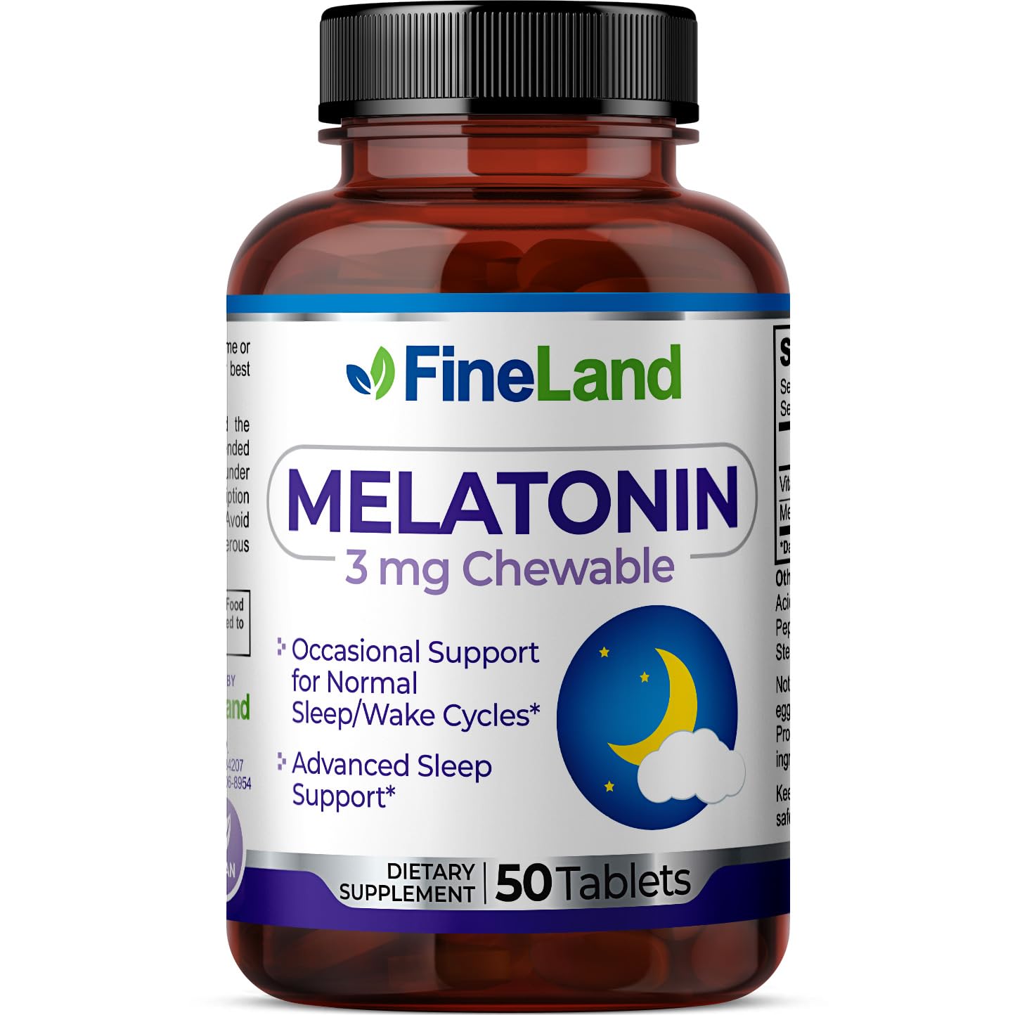 FineLand MELATONIN 3mg Chewable 50 Tablets 50 Day Supply Fast Dissolve Normal Sleep Wake Cycles Support Sleep Aid Premium Healthy Made in USA