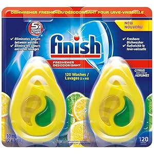 Finish dishwasher freshener clips on to the dishwasher rack to provide 60 wash loads of continued freshness in between washes. Just clip on and have no worries smelling dirty dishes as you place dishes into the dishwasher before it turns on!.World'S 1 recommended brand for dishwashing. Good for 120 washes. Freshens the dishwasher with a citrus scent. Eliminates odours between washes.