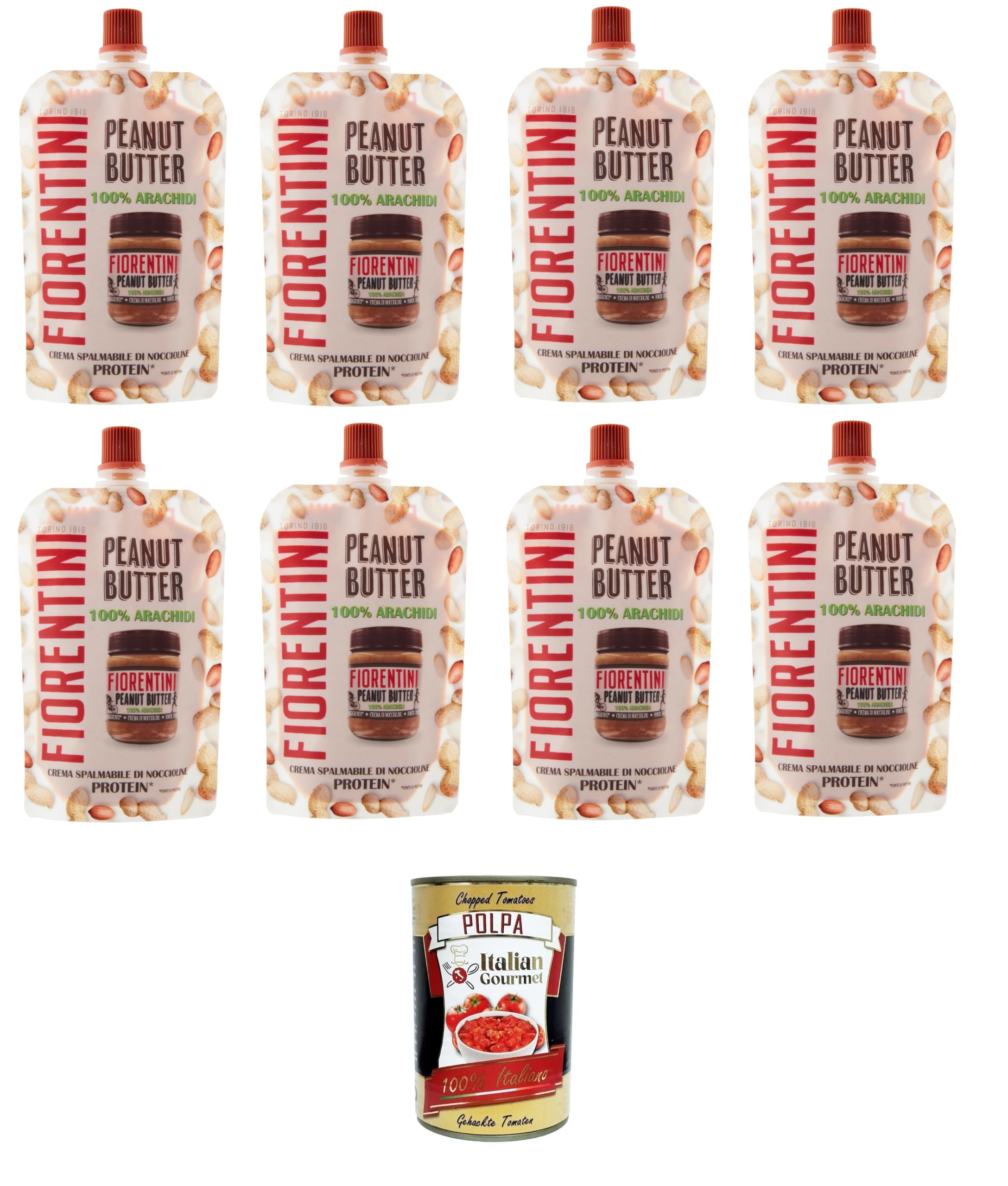 Fiorentini Peanut Butter 100% Peanuts 8 x 100 g Pouch + Italian Gourmet Polpa 400 g Pack of 8