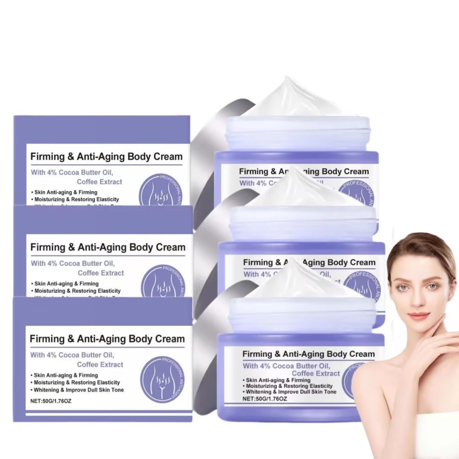 Includes: 1 2 3 PC 50g firming cream SAFETY WARNING YesThis firming cream is suitable for all body skin types. Regular use of this 50 - gram cream can bring improvements to the body skin's firmness, , and overall appearance. The softening effect of this cream is noticeable. It nourishes the skin with nutrients, making the skin texture smoother. It makes the body skin feel more comfortable and less rough. With its wrinkle function, this body cream contains active components that work on reducing the appearance of wrinkles. It smooths out the fine lines, making the skin look younger and more. This 50 - gram firming cream is a remarkable body care product. It is formulated with potent ingredients to the signs of aging. The cream helps to firm the skin, reducing sagging and improving the skin's elasticity. The moisturizing property of this cream is excellent. It penetrates into the skin, providing hydration. This keeps the skin soft and supple, dryness and maintaining. Includes: 1 2 3 PC 50g firming cream AVERTISSEMENT DE SÛRETÉ YesThis firming cream is suitable for all body skin types. Regular use of this 50 - gram cream can bring improvements to the body skin's firmness, , and overall appearance. The softening effect of this cream is noticeable. It nourishes the skin with nutrients, making the skin texture smoother. It makes the body skin feel more comfortable and less rough. With its wrinkle function, this body cream contains active components that work on reducing the appearance of wrinkles. It smooths out the fine lines, making the skin look younger and more . This 50 - gram firming cream is a remarkable body care product. It is formulated with potent ingredients to the signs of aging. The cream helps to firm the skin, reducing sagging and improving the skin's elasticity. The moisturizing property of this cream is excellent. It penetrates into the skin, providing hydration. This keeps the skin soft and supple, dryness and maintaining.