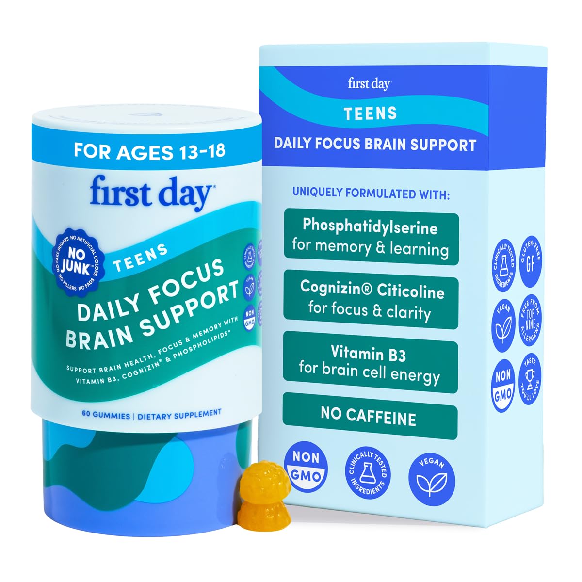 FIRST DAY Teen Brain & Focus Supplement Gummies Ages 13 18 | Study & Concentration Support with Cognizin Citicoline & Phosphatidylserine | Vegan, Non-GMO, Caffeine-Free | 30-Day Supply