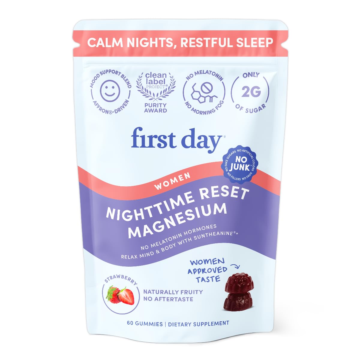 First Day Women s Nighttime Reset Calming Magnesium Gummies Sleep Aid Supports Peaceful Rest Balanced Mood & Energy Supplement with Magnesium Citrate L-Theanine & No Melatonin 30-Day Supply 60 Count (Pack of 1)