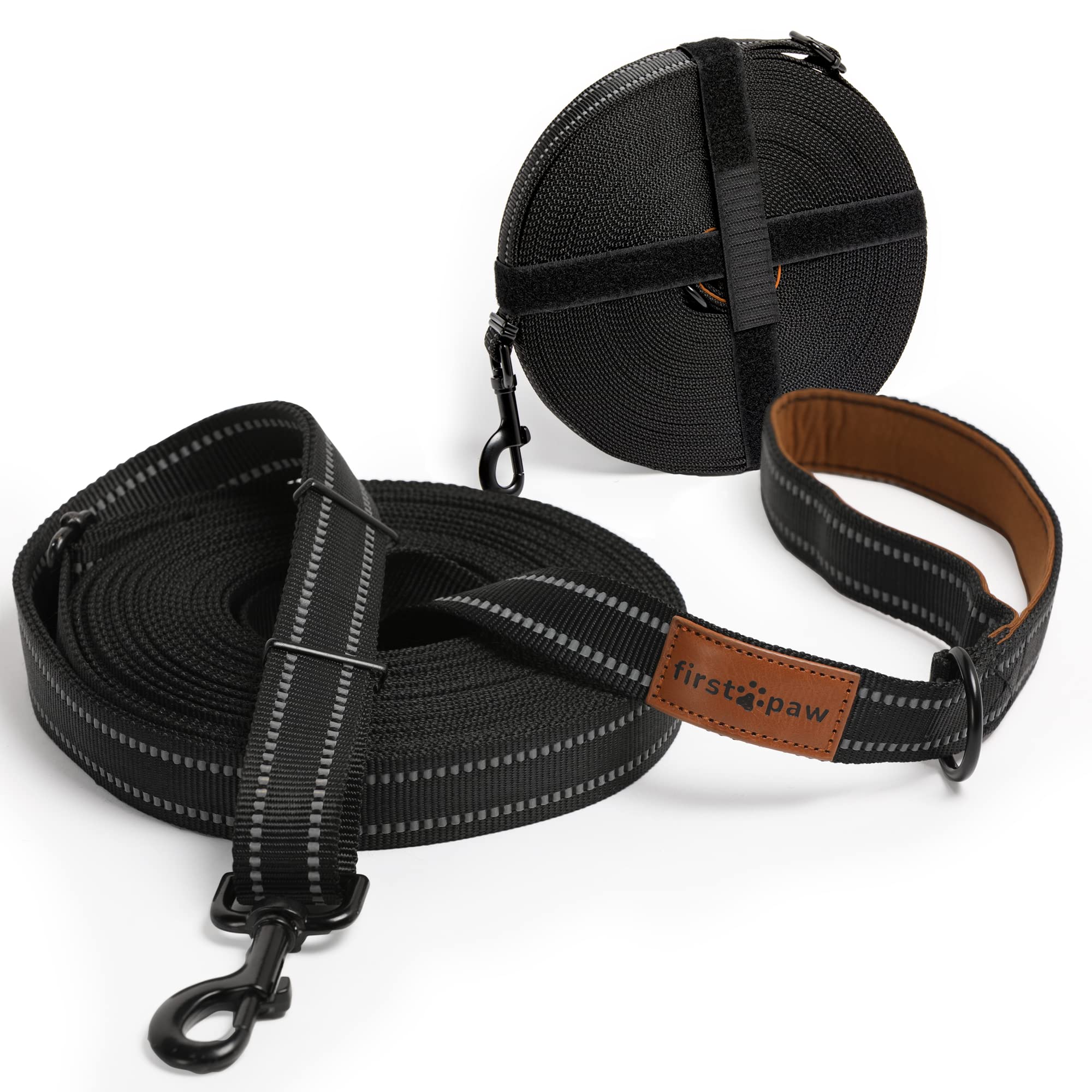 For all dogs - ideal for your dog during training, games, fun, education.The O-ring, which is located directly under the handle, enables you to attach small accessories.Easy to stow and transport - if you do not use the first paw dog leash, just roll it up, fasten them with the Velcro tapes and put them in the mains pocket.Adjustable length - The 20 m long training line for dogs from Firstpaw has a setting clip with which it can be set from 10 m to 20 m.Robust and durable material - made from durable PP belt band.Sewed seamlessly and provided with a padded handle, it offers both strength and comfort for everyday use in any weather.More freedom - The 20 meter long dog leash from Firstpaw offers your dog more freedom in the forest, park or garden.Perfect for obedience and recall training.Suitable for the daily walk, running, training and other outdoor sports.Fur Alle Hunde - Ideal für Ihrem Hund bei Training, Spiel, Spaß, Erziehung. Der O-Ring, der sich direkt unter dem Griff befindet, ermöglicht es Ihnen, kleines Zubehör zu befestigen. Leicht zu verstauen und zu transportieren - Wenn Sie die FirstPaw Hundeleine nicht benutzen, rollen Sie sie einfach auf, befestigen Sie sie mit den Klettbändern und stecken Sie sie in die Netztasche. Einstellbare Länge - Die 20 m lange Trainingsleine für Hunde von FirstPaw verfügt über einen Einstellclip, mit dem sie von 10 m auf 20 m eingestellt werden kann. Robustes und haltbares Material - Hergestellt aus haltbarem PP-Gurtband. Nahtlos genäht und mit einem gepolsterten Griff versehen, bietet es sowohl Stärke als auch Komfort für den täglichen Gebrauch bei jedem Wetter. Mehr Freiheit - Die 20 Meter lange Hundeleine von FirstPaw bietet Ihrem Hund mehr Freiheit im Wald, Park oder Garden an. Perfekt für Gehorsam und Rückruf Training. Geeignet für den täglichen Spaziergang, Laufen, Training und andere Outdoorsports.FIRSTPAW Schleppleine für Hunde 5m / 7m / 10m / 15m / 20m - Robuste Hundeleine mit Griffpolsterung - Schleppleine für kleine, mittlere und Große Hunde - Trainingsleine für Hunde mit Netztasche Verstellbar von 5 bis 20M Schwarz