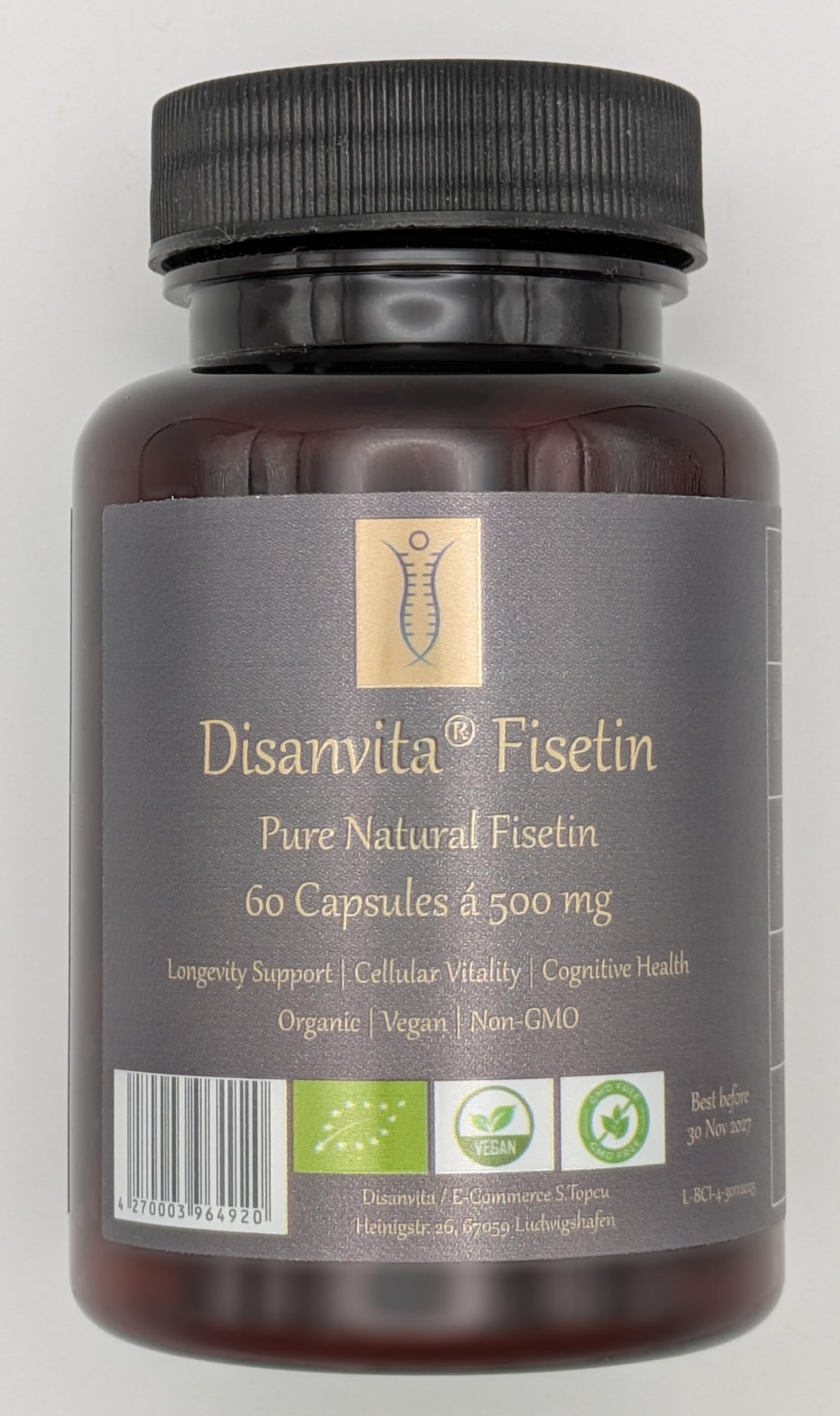 : Disanvita Fisetin is a high-purity fisetin in capsule form, developed for those who value quality, purity, and ingredients based on sound scientific principles. Fisetin is a naturally occurring flavonoid found in select fruits and vegetables, such as strawberries and apples, and has been the subject of scientific research for years. In the scientific community, fisetin is recognized for its antioxidant properties and is studied in relation to oxidative processes at the cellular level—a field of research that plays a central role in the long-term understanding of cellular functions. Furthermore, fisetin is being examined in studies on cognitive processes. For this reason, it often attracts the interest of people who, as part of a mindful lifestyle and balanced diet, focus on mental clarity and concentration. Another area of ??research concerns the role of fisetin in cellular aging processes. In this context, it is studied in relation to mechanisms involved in the natural regulation of age-related processes in the body—an aspect that makes fisetin particularly interesting for long-term health approaches. Directions for use: Take 1 capsule daily, swallowed whole with sufficient liquid, preferably with a meal containing some fat. Do not exceed the recommended daily dose. Food supplements should not be used as a substitute for a varied and balanced diet and a healthy lifestyle. Ingredients: FisetineNO ARTIFICIAL ADDITIVES OR COLORS: Disanvita Fisetin is composed of high-purity, plant-based, food-grade fisetin, with no additives. SUPPORTS GENERAL HEALTH AND VITALITY: Disanvita Fisetin has been developed to complement a balanced diet and provide a carefully adjusted amount of fisetin for a reliable daily intake. HEALTHY AGING LONGEVITY: Fisetin is a naturally occurring flavonol, known for its antioxidant properties and studied in relation to age-related cellular processes. PRECISE DOSAGE FOR OPTIMIZED BIOAVAILABILITY: Each capsule contains 500 mg of pure fisetin, formulated for optimal absorption by the body. SUPERIOR QUALITY: Disanvita Fisetin boasts a purity of 99.7 . The quality has been tested by an independent laboratory in Switzerland.Description du produit Disanvita Fisetin est une fisétine de haute pureté sous forme de capsules , développée pour les personnes qui accordent de l'importance à la qualité, à la pureté et à des ingrédients fondés sur des bases scientifiques solides. La fisétine est un flavonoïde d'origine naturelle présent dans certains fruits et légumes sélectionnés, tels que les fraises et les pommes, et fait depuis des années l'objet de recherches scientifiques. Dans le domaine scientifique, la fisétine est reconnue pour ses propriétés antioxydantes et est étudiée en lien avec les processus oxydatifs au niveau cellulaire — un champ de recherche qui joue un rôle central dans la compréhension à long terme des fonctions cellulaires. Par ailleurs, la fisétine est examinée dans des études portant sur les processus cognitifs. Pour cette raison, elle suscite souvent l'intérêt de personnes qui, dans le cadre d'un mode de vie conscient et d'une alimentation équilibrée, portent attention à la clarté mentale et à la concentration. Un autre axe de recherche concerne le rôle de la fisétine dans les processus de vieillissement cellulaire. Dans ce contexte, elle est étudiée en relation avec des mécanismes impliqués dans la régulation naturelle des processus liés à l'âge dans l'organisme — un aspect qui rend la fisétine particulièrement intéressante pour des approches de santé orientées sur le long terme. Conseils d'utilisation : Prendre 1 capsule par jour , à avaler entière avec une quantité suffisante de liquide, de préférence au cours d'un repas contenant un peu de matières grasses . Ne pas dépasser la dose journalière recommandée. Les compléments alimentaires ne doivent pas être utilisés comme substituts d'une alimentation variée et équilibrée ni d'un mode de vie sain. Ingrédients FisetineSANS ADDITIFS NI COLORANTS ARTIFICIELS : Disanvita Fisetin est composée de fisétine de haute pureté, d'origine végétale et de qualité alimentaire, sans additifs. SOUTIEN DE LA SANTÉ ET DE LA VITALITÉ GÉNÉRALES : Disanvita Fisetin a été développée pour compléter une alimentation équilibrée et fournir une quantité de fisétine soigneusement ajustée pour un apport quotidien fiable. VIEILLISSEMENT SAIN LONGÉVITÉ : La fisétine est un flavonol d'origine naturelle, reconnu pour ses propriétés antioxydantes et étudié en lien avec les processus cellulaires liés à l'âge. DOSAGE PRÉCIS POUR UNE BIODISPONIBILITÉ OPTIMISÉE : Chaque capsule contient 500 mg de fisétine pure, formulée pour une absorption optimale par l'organisme. QUALITÉ SUPÉRIEURE : Disanvita Fisetin présente une pureté de 99,7 . La qualité a été testée par un laboratoire indépendant en Suisse.Fisetin Qualité supérieure testée en laboratoire avec 99,7 de pureté