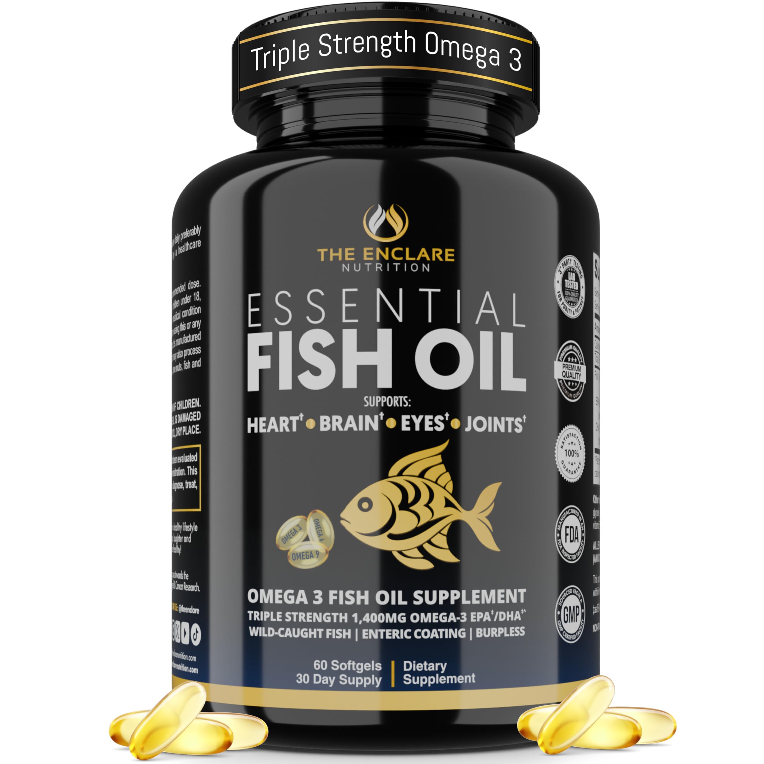 ESSENTIAL FISH OIL - OMEGA 3 SUPPLEMENT FOR WOMEN AND MEN Your Essential Omega-3 — Reimagined for Today's Active Women Men Essential Fish Oil by THE ENCLARE NUTRITION is more than just a fish oil supplement — it's your daily foundation for heart health, brain support, eye wellness, and joint comfort. An essential fatty acid nutritional supplement for both women and men, our triple-strength Omega-3 provides a potent 1,400mg of EPA and DHA in every two-softgel serving. Why Our Omega 3 Fish Oil Soft Gels Stands Out. Most standard Omega 3 supplements deliver low doses or come with fishy burps. Ours is different. Sourced from clean, wild-caught fish, purified for quality, and protected with enteric coating, this formula is made for comfort, absorption, and consistent results. Softgel Capsules Over Liquid — For a Reason. Fish oil liquid often leaves an unpleasant aftertaste. Our enteric-coated softgels offer a burpless no taste experience that's easy to take every day — ideal for adults seeking Omega 3, Omega-3-6-9, or essential fatty acid support. Your Heart Health. Your Brain Health. Your Wellness. Supported. From busy executives to health-focused parents, Essential Fish Oil fits into real life with ease. Whether you're supporting heart health, cognitive clarity, mobility, or everyday vitality, this clean Omega 3 formula delivers wellness without compromise helping you achieve that healthy body year round. Crafted with Purpose. Built on Integrity. Enclare omega-3 fish oil supplement for men and women is perfect for adults. As a women-owned brand, THE ENCLARE NUTRITION is committed to clean ingredients, transparent manufacturing, and global impact. We dare you to be healthy with premium fish oil that is third party tested for purity and potency. Explore Enclare product catalog for more premium supplements for peak health. omaga3 los 10 mejores omega 3 del mundo omeg 3 fishoil fish oils o mega-3 fish oil omga3 fish oil, omga3, suplementos de aceite de pescado.Clean Ingredients, Real Results — Crafted for Purity, Potency Trust: THE ENCLARE NUTRITION is an American-owned, women-owned wellness brand committed to quality, transparency, and effectiveness. All Enclare products are GMP-certified and made with high-quality ingredients, thoughtfully developed with care and purpose. Every purchase helps support global initiatives including girls' education, Vitamin Angels cancer research. Explore Enclare Nutrition for more premium supplements designed to support peak health. A Daily Essential for Every Lifestyle — From Busy Mums to Fitness Lovers: No matter where you are in your wellness journey, Omega-3 fish oil plays a crucial role in supporting whole-body health. Women navigating hormonal shifts, busy mums juggling nonstop days, professionals under stress, weight-loss and fitness enthusiasts, and adults seeking everyday vitality — everyone benefits from adding high-quality Omega-3s to their routine. Gentle on the Stomach – Better Than Fish Oil Liquid: Our Omega 3 softgels are enteric-coated for smoother digestion and fewer aftertaste issues than fish oil liquid supplements. Easy to swallow and ideal for consistent daily use. Omega 3 6 9 Blend Designed for Everyday Vitality: Perfect for adults looking for Omega 3 or Omega 3-6-9 support. Essential Fish Oil delivers a clean, high-quality omega profile that complements your wellness goals and nutritional needs. Supports Heart Brain Eyes Joints – Total Wellness in Two Softgels: Omega-3 EPA and DHA help support a healthy heart, brain, eye function, and joint mobility. A daily omega routine that fits seamlessly into your lifestyle and provides essential fatty acids your body needs. Enteric Coated Burpless – No Fishy Taste: Enjoy Omega 3 benefits without fish burps. Our enteric-coated fish oil capsules digest gently, helping reduce aftertaste while supporting higher absorption. A no burp, non-fishy alternative to messy traditional fish oil liquid formulas. Feel your best with our fish oil omega 3 supplements high dha and epa. Wild-Caught Fish Oil With Clean, High-Purity Omegas — Our fish oil omega 3 supplements come from clean, wild caught fish — never farm-raised. Purity-tested to ensure clean, potent omega 3 fatty acids and the quality you expect from a premium heart and brain health supplement. Triple Strength Omega 3 Fish Oil Supplement for Women Men – 1,400mg EPA DHA: Fuel your wellness with a premium Omega 3 supplement designed for women and men. Each serving delivers 1,400mg of Omega-3 fatty acids, EPA 800mg DHA 600mg — supporting heart health, brain clarity, eye wellness, and comfortable joints.