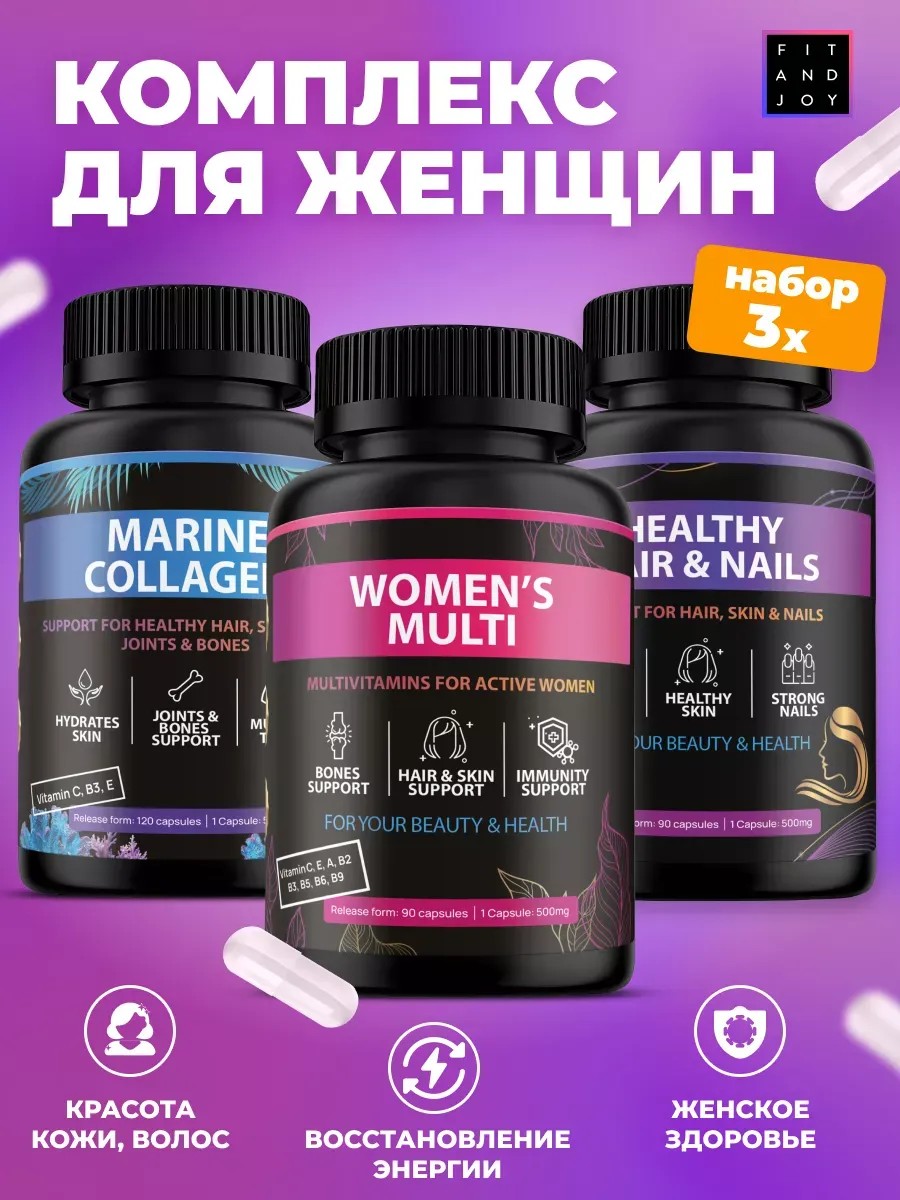 Набор витаминов для женщин от FIT AND JOY - наш набор состоит из 3х продуктов, которые идеально подходят для женской красоты и здоровья. Он состоит из Женских витаминов, Коллагена и Витаминов для волос и ногтей. Женская формула это идеальный витаминно-минеральный комплекс, который содержит в своем составе все, что необходимо для полноценной работы женского организма. Состав идеально сбалансирован с учетом суточной потребности женского организма в витаминах и минералах. Активные компоненты, входящие в состав, способствуют синтезу коллагена и кератина, предотвращению появления морщин. Поддерживают здоровье и красоту волос, улучшают их рост и препятствуют выпадению, укрепляют ногти. Обладают антиоксидантным действием, способствуют замедлению процессов старения и поддержанию молодости и красоты. Мультивитамины и минералы, входящие в состав участвуют в регуляции менструального цикла, снижают негативные проявления предменструального синдрома. Наши витамины отодвигают наступление менопаузы и уменьшают климактерические проявления. Витаминный комплекс для женщин создан с вниманием и заботой к женскому организму. Способ применения: взрослым по 3 капсулы раз в день во время еды. Коллаген в капсулах идеальный комплекс мультивитаминов для поддержания красоты, здоровья и молодости организма. Регулярное использование колагена в капсулах способствует устранению морщин, ускорению процесса регенерации кожи, выведению токсинов, детокс очищениию организма, укреплению ногтей и волос и суставной ткани. Кроме того, этот белок влияет на выносливость, качество сна и пищеварения. Наш collagen подходит для мужчин и женщин, витаминный комплекс с коллагеном помогает избежать таких несовершенств, как растяжки и дряблость кожи. Колаген легко усваивается и быстро восстанавливает недостающий коллаген в организме. Наш продукт без пищевых красителей и наполнителей имеет мощный накопительный эффект. Наши витамины для волос и ногтей специально разработаны для стимулирования роста и укрепления ваших волос и ногтей. Каждая капсула содержит мощную смесь необходимых витаминов и минералов, тщательно отобранных для поддержания здоровья и жизнеспособности ваших волос и ногтей. Наши ингредиенты работают синергетически, питая волосяные фолликулы и укрепляя структуру ногтевой пластины изнутри. Попрощайтесь с ломкостью, секущимися кончиками и ломкостью ногтей с помощью наших капсул, которые легко глотать. Просто включите наши витамины в свой распорядок дня и наблюдайте, как ваши волосы становятся длиннее и сильнее, а ногти становятся более упругими и красивыми. Мы гордимся тем, что поддерживаем самые высокие стандарты качества и безопасности, чтобы гарантировать, что вы получите продукт, который одновременно эффективен и безопасен в использовании. Взрослым принимать по 1 капсуле 2 раза в день после еды.