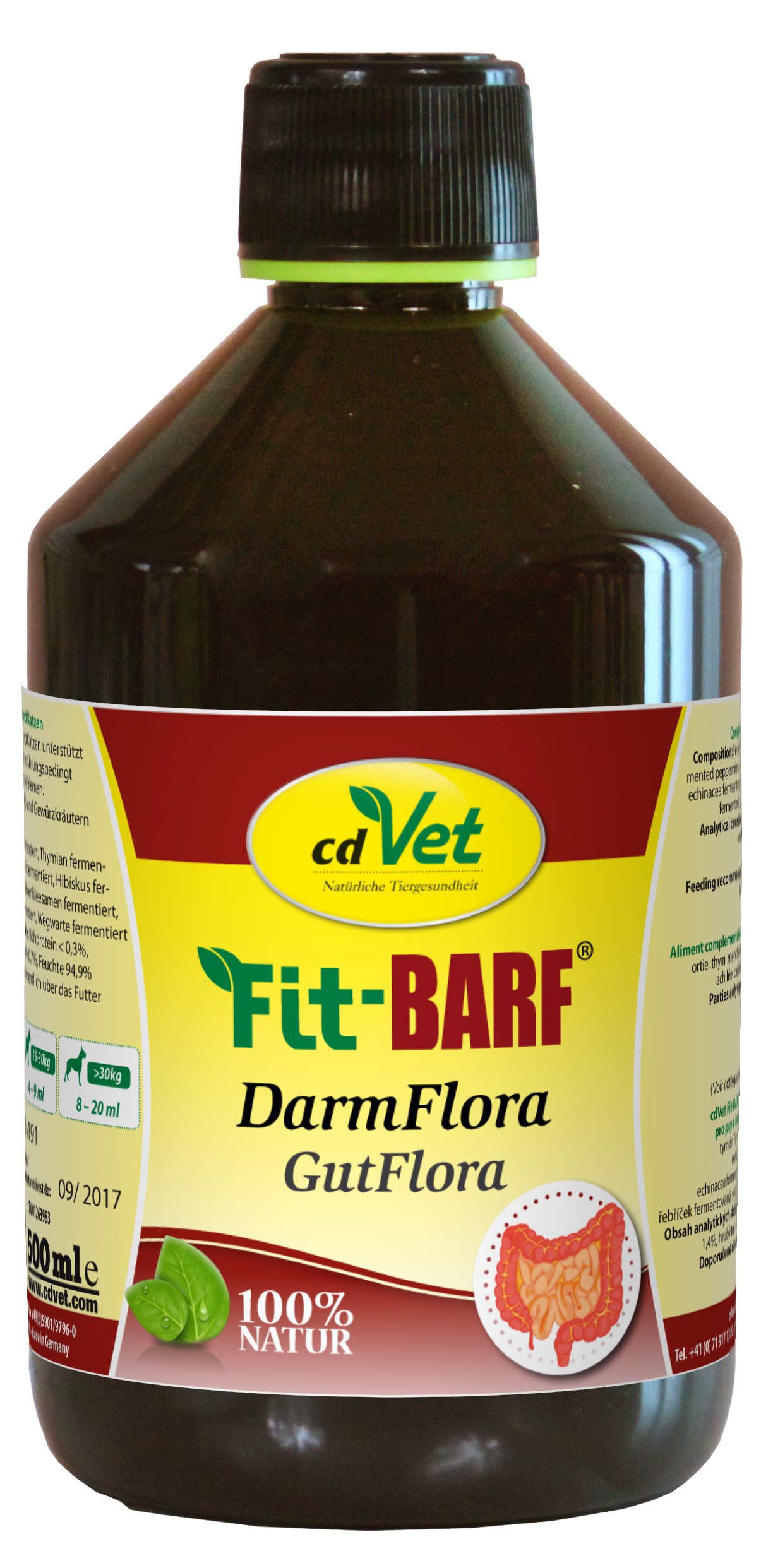fiber 1,,4%, raw fat 0.2%, raw ash 0.7%, moist 94.9%feeding recommendation: cats, small dogs up to 3kg: 1 - 2ml;Dogs 3 - 15kg: 2 - 5ml;Dogs 15 - 30kg: 4 - 9ml;Dogs over 30kg: 8 - 20ml 1 - 2 times a week over the food from frost and heat protect! Ingredients / ingredients Composition: fermented nettle, fermented thyme, fermented, peppermint fermented, oregano fermented, hibiscus fermented, echinacea fermented, bockshorn clover segment fermented, yarrow fermented, fermented, gunning away fermented Instructions Cats, small dogs up to 3kg: 1 - 2ml;Dogs 3 - 15kg: 2 - 5ml;Dogs 15 - 30kg: 4 - 9ml;Dogs over 30kg: 8 - 20ml 1 - 2 times a week over the food More with veterinary practitioners, veterinarians and pet owners developed.To compensate for an increased nutrient requirement in times of increased intestinal activity, e.g. when changing the feed.A healthy balanced intestine ensures a strengthened immune system.Contains a fermented plant excerpt - to support the intestinal flora.Supplementary feed for the probiotic supply of the intestinal flora. Im Darm befinden sich Milliarden kleinster Mikroorganismen. Man unterscheidet zwischen pathogenen Bakterien (krank machenden Erregern) und für die gesunde Darmflora förderliche Bakterien wie z.B. Milchsäurebakterien. Diese „guten"" Bakterien sind fleißige Helfer des Immunsystems und haben einen positiven Einfluss auf die Verdauungssäfte, Enzyme und die Darmschleimhaut. Die Krankheitserreger werden regelrecht bekämpft und verdrängt. Zudem sorgt eine intakte Darmflora für gute Verdauung. 1. Verdrängung pathogener Bakterien 2. Stimulation des Immunsystems 3. Verbesserter Aufschluss der Nahrung 4. Aufrechterhaltung der Darmperistaltik Wird die natürliche Darmflora gestört, kann es zu einer übermäßigen Besiedelung durch Krankheitserreger kommen und der Hund bekommt Durchfall. Auch Antibiotika-Behandlungen können die Schutzfunktion angreifen - oft unterscheiden die Medikamente nicht zwischen „guten"" und „bösen"" Bakterien. Die Darmflora ist gestört, ihr Abwehrmechanismus funktioniert nur noch eingeschränkt und die Darmwand wird in Mitleidenschaft gezogen. Der Vorfahre unseres Hundes - der Wolf - frisst daher auch die Verdauungsorgane seines Beutetieres. Sie enthalten alle notwendigen Mikroorganismen für eine gut funktionierende Darmflora. Nicht immer besteht die Möglichkeit frischen Pansen oder Blättermagen zu füttern. Auch gefroren gleichen sie den Mangel an wertvollen Bakterien und Enzymen nicht aus, da diese durch die Frostung zerstört werden. Diesen Mangel kann man mit fermentierten Kräutern sehr gut ausgleichen. Daher empfiehlt sich eine regelmäßige Fütterung mit Fit-BARF DarmFlora, auch bei ernährungsbedingt gestörter Darmflora sowie bei Verdauungsproblemen. Ergänzungsfuttermittel für Hunde und Katzen Zusammensetzung: Brennnessel fermentiert, Thymian fermentiert, Pfefferminze fermentiert, Oregano fermentiert, Hibiskus fermentiert, Echinacea fermentiert, Bockshornkleesamen fermentiert, Schafgarbe fermentiert, Labkraut fermentiert, Wegwarte fermentiert Analytische Bestandteile und Gehalte: Rohprotein 0,3%, Rohfaser 1,4%, Rohfett 0,2%, Rohasche 0,7%, Feuchte 94,9% Fütterungsempfehlung: Katzen, kleine Hunde bis 3kg: 1 - 2ml; Hunde 3 - 15kg: 2 - 5ml; Hunde 15 - 30kg: 4 - 9ml; Hunde über 30kg: 8 - 20ml 1 - 2 mal wöchentlich über das Futter geben Vor Frost und Hitze schützen! INHALTSSTOFFE / ZUTATEN Zusammensetzung: Brennnessel fermentiert, Thymian fermentiert, Pfefferminze fermentiert, Oregano fermentiert, Hibiskus fermentiert, Echinacea fermentiert, Bockshornkleesamen fermentiert, Schafgarbe fermentiert, Labkraut fermentiert, Wegwarte fermentiert GEBRAUCHSANWEISUNG Katzen, kleine Hunde bis 3kg: 1 - 2ml; Hunde 3 - 15kg: 2 - 5ml; Hunde 15 - 30kg: 4 - 9ml; Hunde über 30kg: 8 - 20ml 1 - 2 mal wöchentlich über das Futter geben MehrMit Tierheilpraktikern, Tierärzten und Tierbesitzern entwickelt. Zum Ausgleich eines erhöhten Nährstoffbedarfs in Zeiten erhöhter Darmaktivität z.B. bei Futterumstellung. Ein gesunder ausgeglichener Darm sorgt für ein gestärktes Immunsystem. Enthält einen fermentierten Pflanzenauszug - Zur Unterstützung der Darmflora. Ergänzungsfuttermittel zur probiotischen Versorgung der Darmflora.