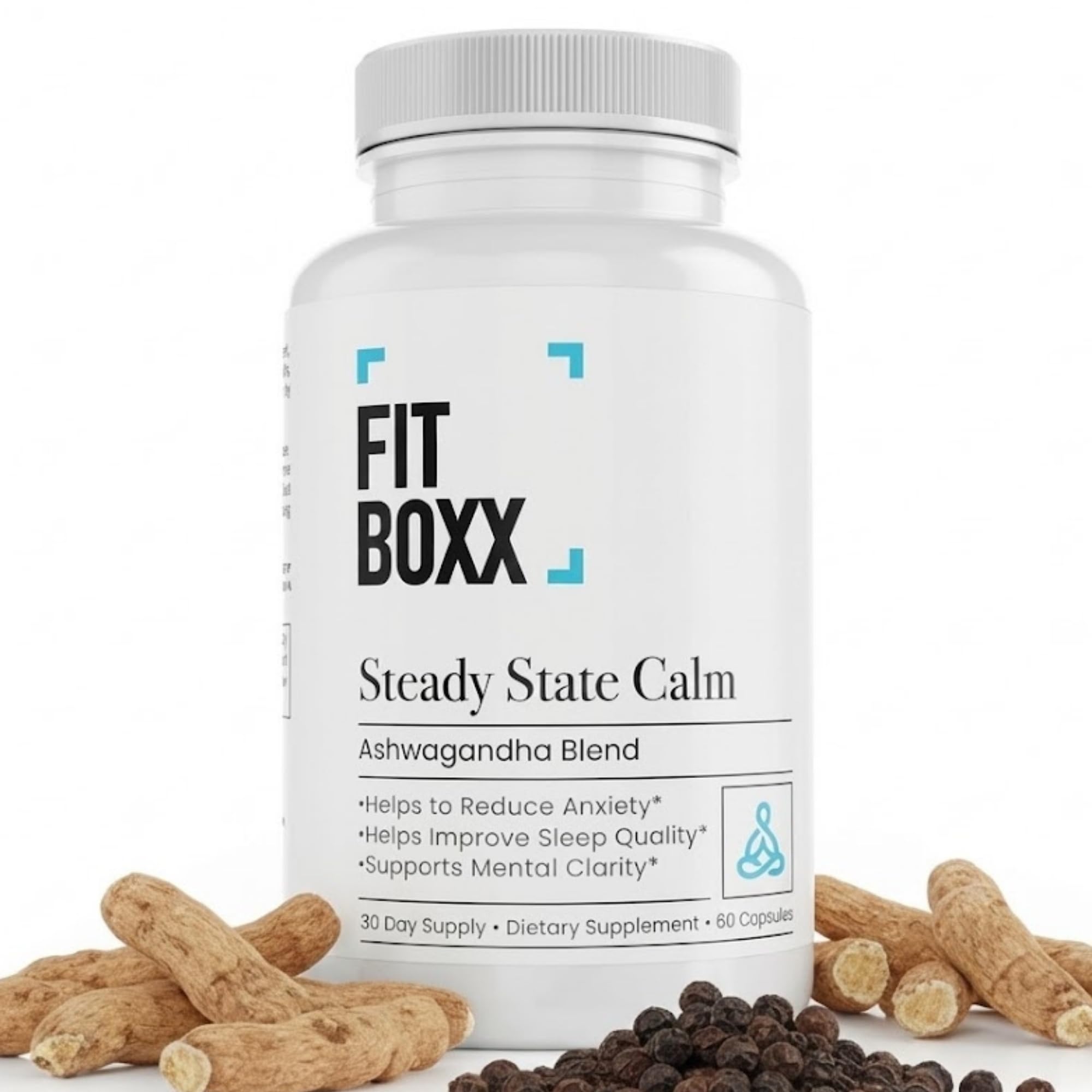 Fit Boxx SteadyState Calm | Pure Ashwagandha Supplements 650mg with Bioperine Natural Adaptogen Capsules to Support Stress Relief & Mood Balance Vegan, Non-GMO, Gluten Free 60 Capsules