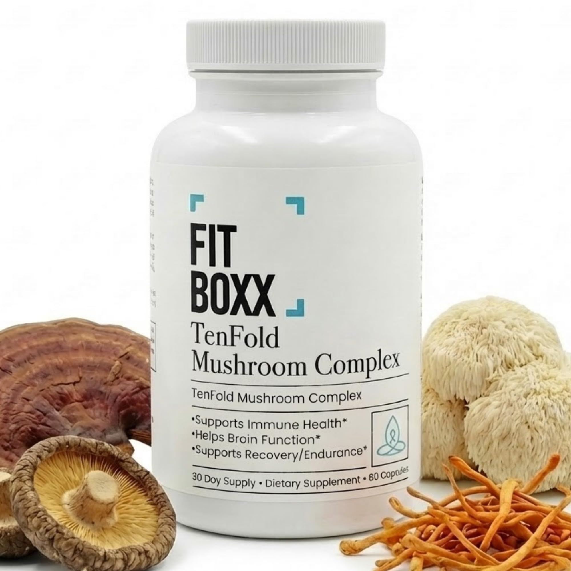 Fit Boxx TenFold Mushroom Complex 10 Functional Mushrooms with Lion s Mane, Reishi & Cordyceps Daily Immune Support, Brain Focus, Natural Energy & Stress Balance 60 Capsules (30 Day Supply)