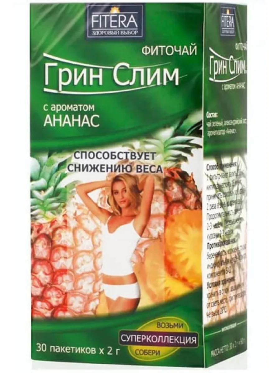 Фиточай грин-слим ти с ананасом - это чайный напиток, который обладает множеством полезных свойств для здоровья человека. В каждом пакетике содержится 2 грамма трав, которые способствуют снижению веса. Нормализует обмен веществ. Улучшает пищеварение. В результате регулярного употребления этого фиточая ваше тело будет чувствовать легкость и свежесть, а вы сможете поддерживать свою форму в отличной кондиции. Кроме того, чай обладает приятным вкусом и ароматом, который дарит вам приятные ощущения и улучшает настроение.