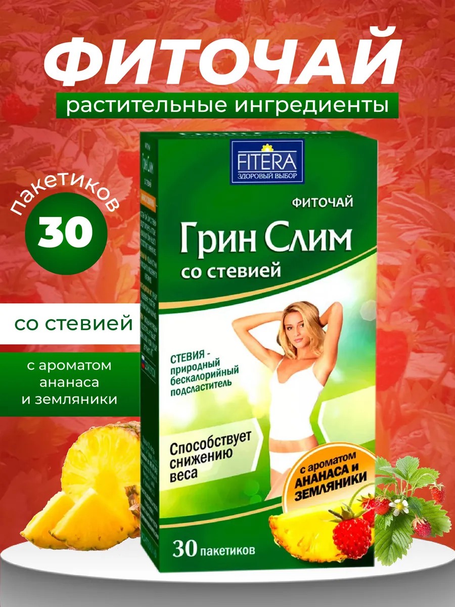 Фиточай Fitera Грин Слим со вкусом земляники и ананаса — это натуральный травяной сбор на основе листьев, плодов, цветков и семян лесных и садовых растений. Обладает мягким слабительным, мочегонным и очищающим действием. Способствует снижению веса, выведению шлаков и нормализации пищеварения.