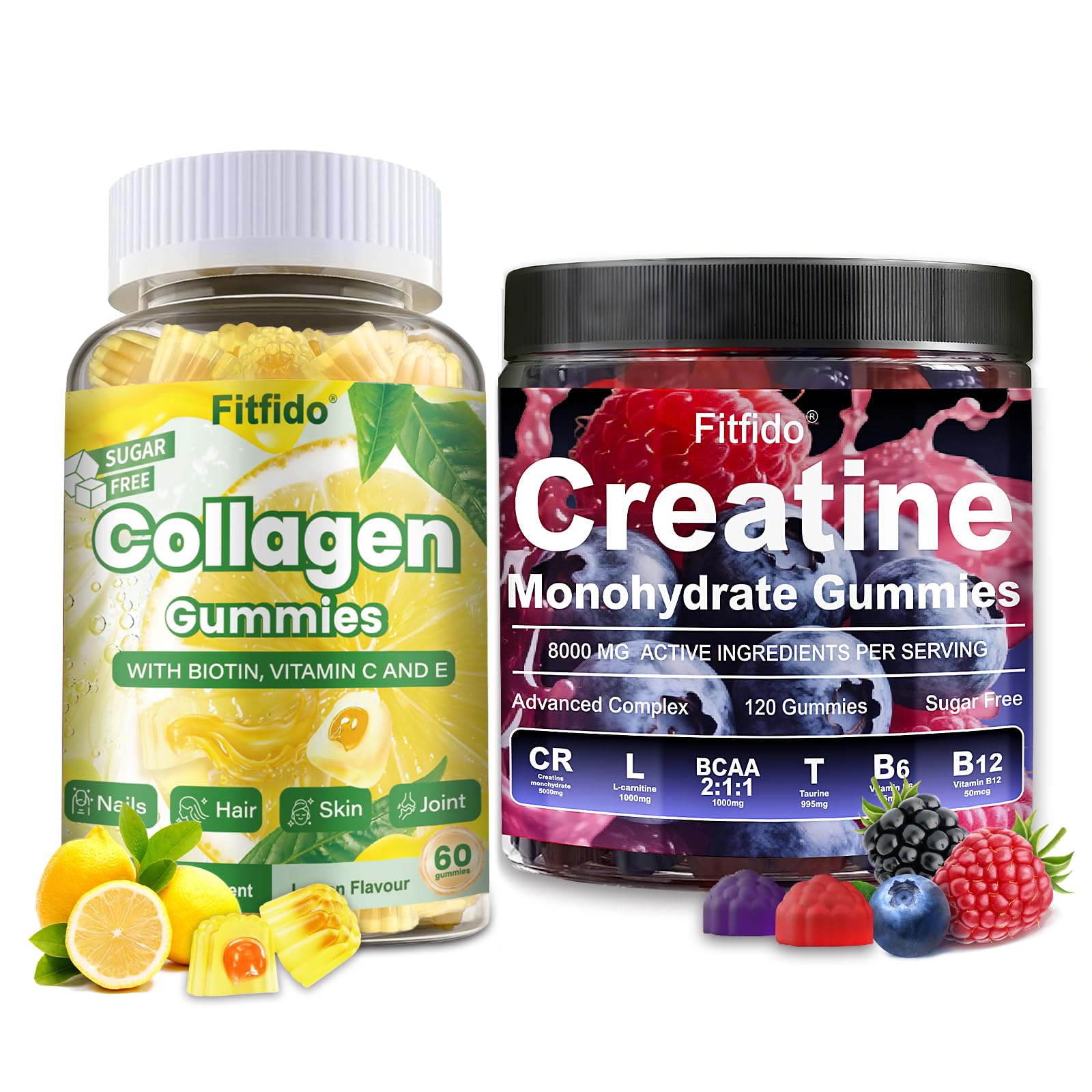 Fitfido Collagen Gummies are uniquely formulated with antioxidants and essential nutrients to support a healthy immune system, promote collagen formation, maintain skin structure and elasticity, and more. Collagen is a key component of healthy, radiant skin, and Sea Buckthorn is a unique and highly revered superfood. Formulated with 1500mg of hydrolyzed multi-collagen peptides, these gummies provide collagen types I, II, III, III, V, and X. The hydrolyzed form allows for better absorption, supporting collagen renewal, elasticity, and hydration for a radiant, youthful appearance. Fitfido Collagen Gummies contain 200mg of hydrolyzed collagen peptides to support skin elasticity and firmness. They are also formulated with 2500mcg of biotin to support strong nails and hair. Vitamin C is important for collagen synthesis. Vitamin E and zinc, fat-soluble antioxidants, fight free radicals, keeping skin protected and radiant. They are also important for maintaining skin elasticity and hydration.2-Pack Supplement Bundle: Convenient daily gummies for men and women-no mixing, water, or prep needed. Clean,Vegan,Sugar Free: Made without gelatin, gluten, or artificial ingredients-pleasant flavor and easy to take. High-Absorption Collagen: Collagen Gummies with antioxidants and essential nutrients, support skin elasticity and firmness. Creatine Complex 8000mg: Features L-Carnitine, BCAAs, Taurine B12 to support performance and endurance. Balanced Daily Support: Two formulas for strength, energy, and physical wellbeing-made to fit an active lifestyle.