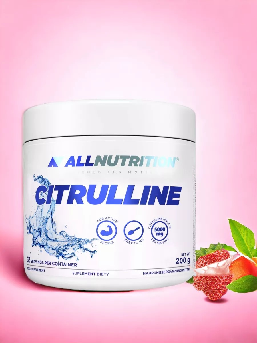 All Nutrition Citrulline 200 grams, strawberry flavor, is a combination of L-citrulline and malate (malic acid). This product increases performance, delays fatigue, and accelerates regeneration. Citrulline improves blood flow to muscles, increases strength, and removes toxins, including lactic acid and ammonia. Citrulline is suitable for high-intensity training, such as strength training, weightlifting, and sprinting. Citrulline malate can be used in conjunction with taurine to achieve a significant muscle pump effect and improve overall appearance. The maximum effect of citrulline occurs on the 15th day of use, but the first positive sensations appear as early as the 3rd-4th day. Directions: Take 2 servings daily. Citrulline is recommended to be taken on an empty stomach 20-30 minutes before training. An additional serving can be taken in the morning and before bed. The recommended course duration is 1-2 months. However, citrulline can be taken on a continuous basis – without breaks.
