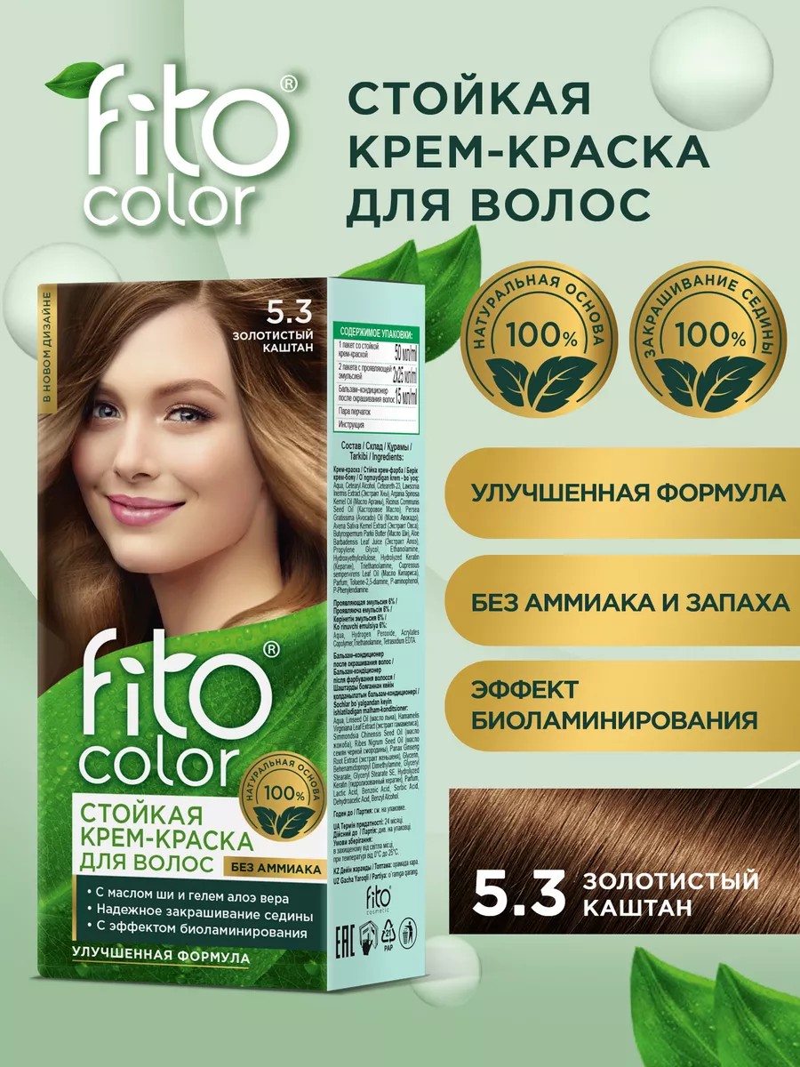 | Full product name | Permanent cream hair dye from the "Fitocolor" series, tone 5.3 golden chestnut, 115 ml |