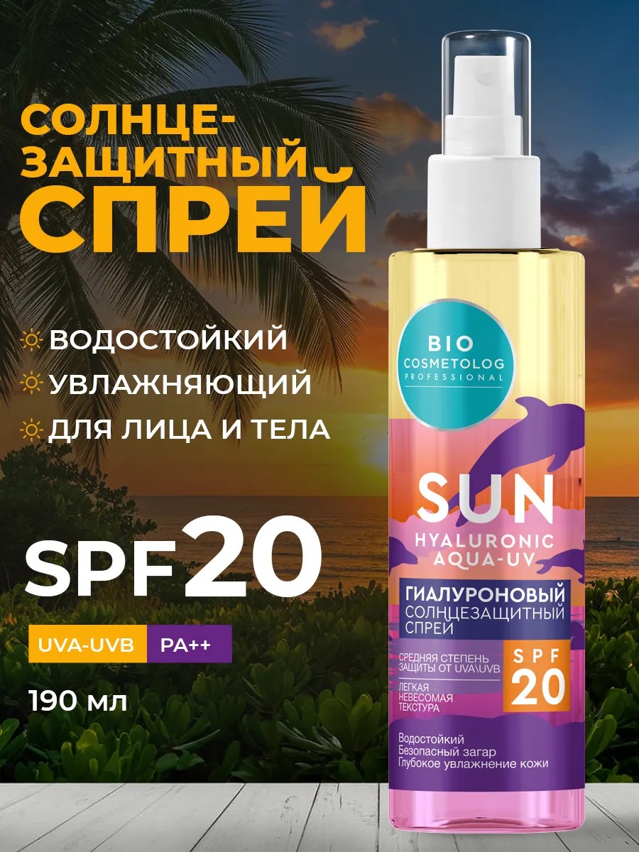 | Полное наименование товара | ГиалуроновыйсолнцезащитныйспрейSPF20серииBIOCOSMETOLOGPROFESSIONAL,190мл |