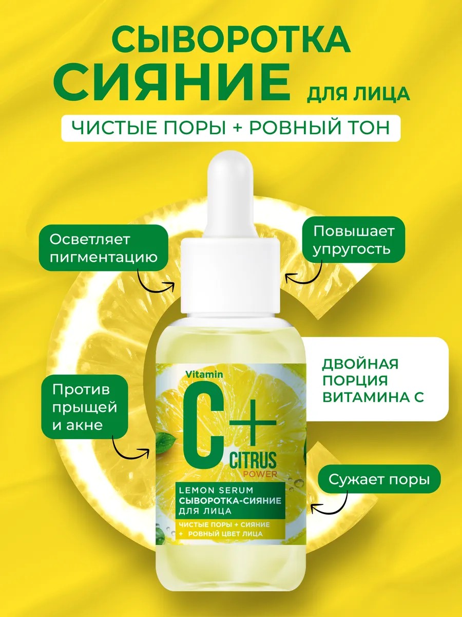 Сыворотка - сияние для лица LEMON SERUM C+Citrus от Фитокосметик с AHA-кислотами и витамином С для очищения лица и сужения пор мгновенно дарит коже ощущение чистоты, свежести и ухоженный вид, становясь незаменимым средством в вашем ежедневном уходе. Уникальная формула включает двойную порцию витамина С и фруктовые AHA-кислоты, которые мягко и глубоко очищают кожу, способствуя сужению пор и выравниванию тона, благодаря чему ваша кожа приобретает сияние и более ровный микрорельеф.