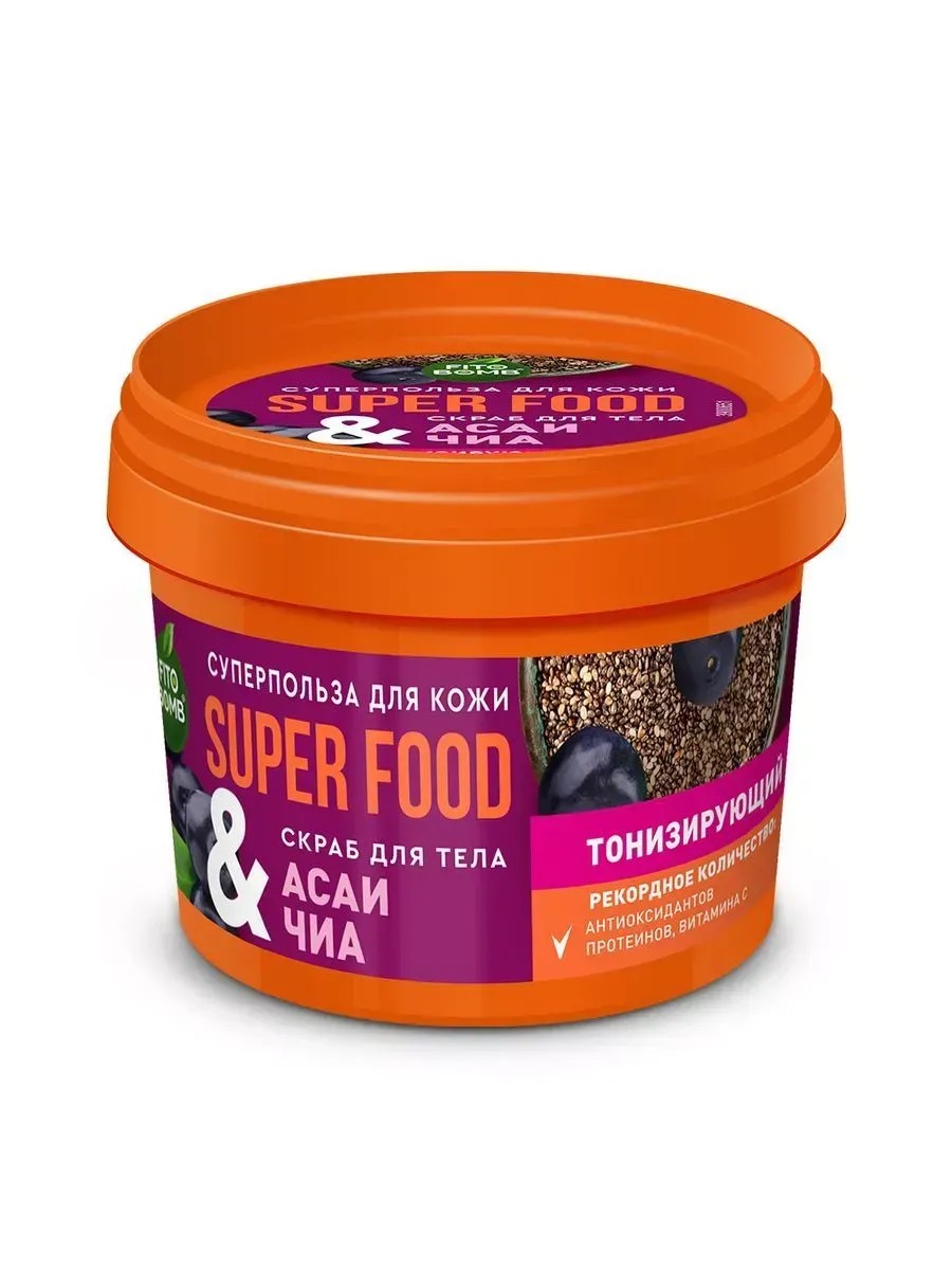 Fito Cosmetic, Acai & Chia Toning Super Food Body Scrub, 100 ml, 1 pc. This acai and chia body scrub cleanses, tones, and energizes the skin. Acai berries are a powerful superfood that deliver a boost of nutrients and softens. Chia seeds contain a record amount of antioxidants for smooth, beautiful skin. Apply to clean, damp skin, massage in, and rinse with water.