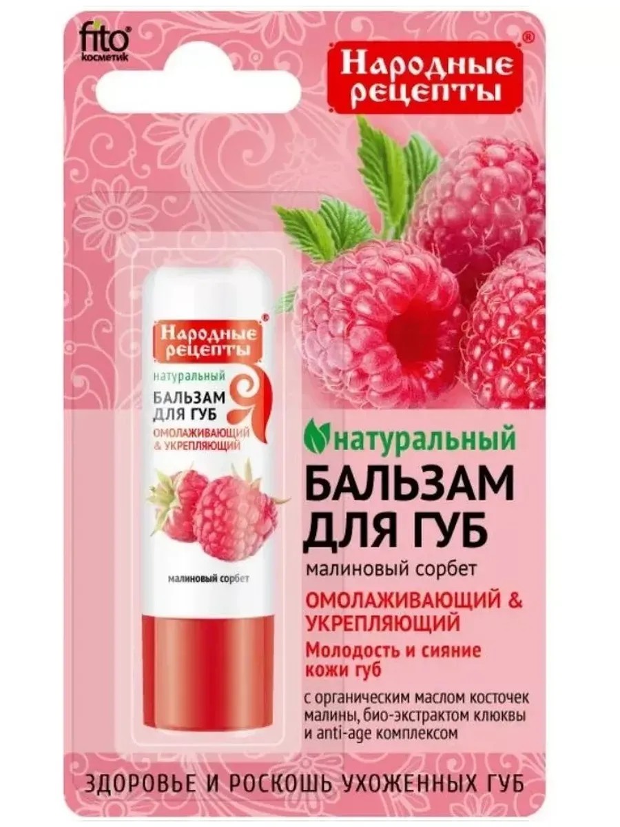 Raspberry Sorbet Folk Recipe Lip Balm. This natural formula, enriched with organic raspberry seed oil, cranberry bio-extract, and an anti-aging complex, perfectly nourishes, strengthens, smoothes fine lines, restores elasticity and firmness, and gives lips a youthful, beautiful appearance.
