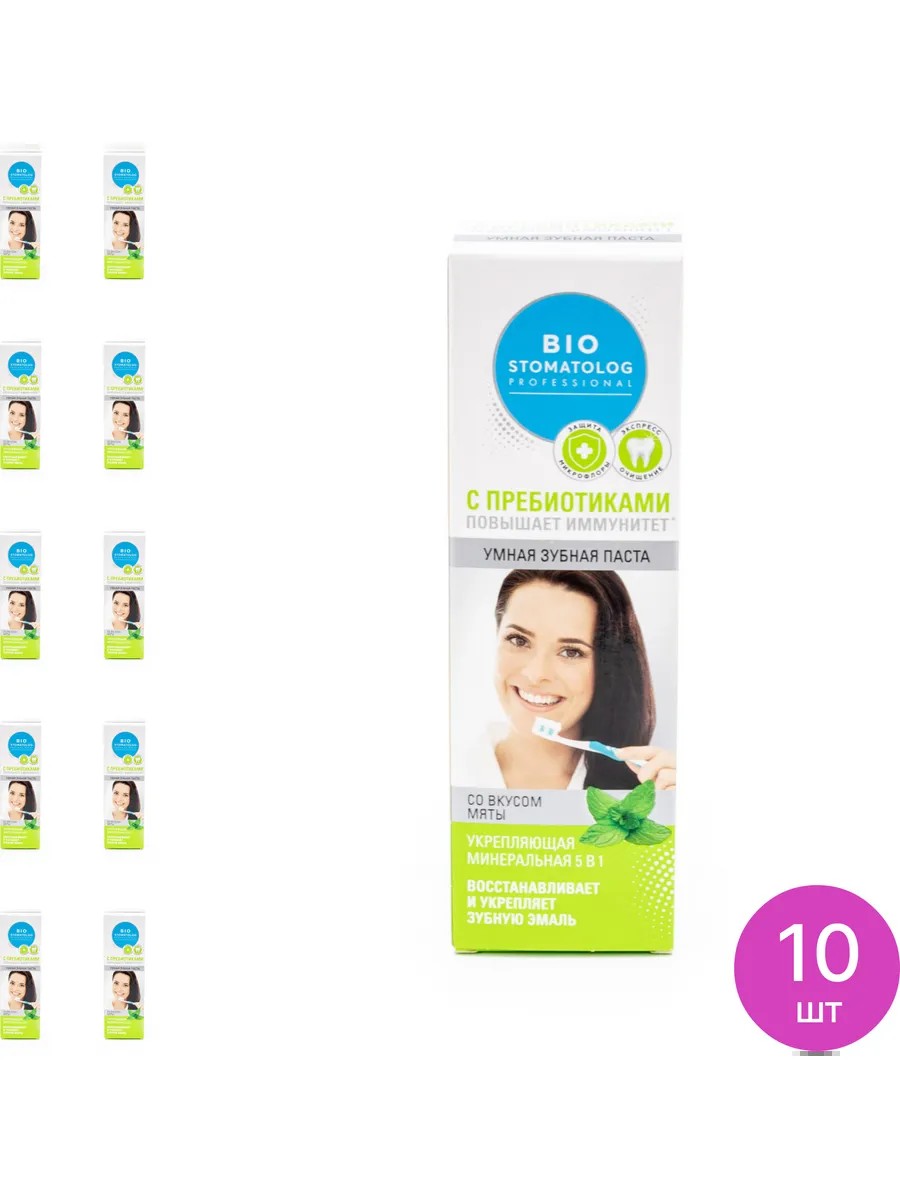 Fito Cosmetic toothpaste / Bio stomatolog professional strengthening mineral 5 in 1 with mint flavor, 75g tube / oral care / enamel restoration and strengthening / fresh breath. The set consists of 10 pcs. Price per set. - Smart toothpastes "Bio stomatolog professional" are the latest highly effective teeth cleaning products that can create a protective barrier against various bacteria. All products contain prebiotics that normalize microflora and increase local immunity of the oral cavity. Toothpastes "Bio stomatolog professional" help quickly and gently clean teeth, and also stimulate the process of their natural remineralization, eliminating microdamage and sealing tooth enamel. - Smart toothpaste Strengthening mineral 5 in 1 is an effective product for impeccable oral care and maximum protection against caries. It gently and delicately cleanses teeth from plaque, quickly restores and strengthens tooth enamel. Its active ingredients soothe gums, prevent enamel thinning, and maintain the natural whiteness of teeth. Daily use of this strengthening toothpaste will keep your teeth healthy and strong, and your smile whiter for a long time. - - Toothpaste / Cavity Protection / Fresh Breath / Comprehensive Oral Care / Dental Care.