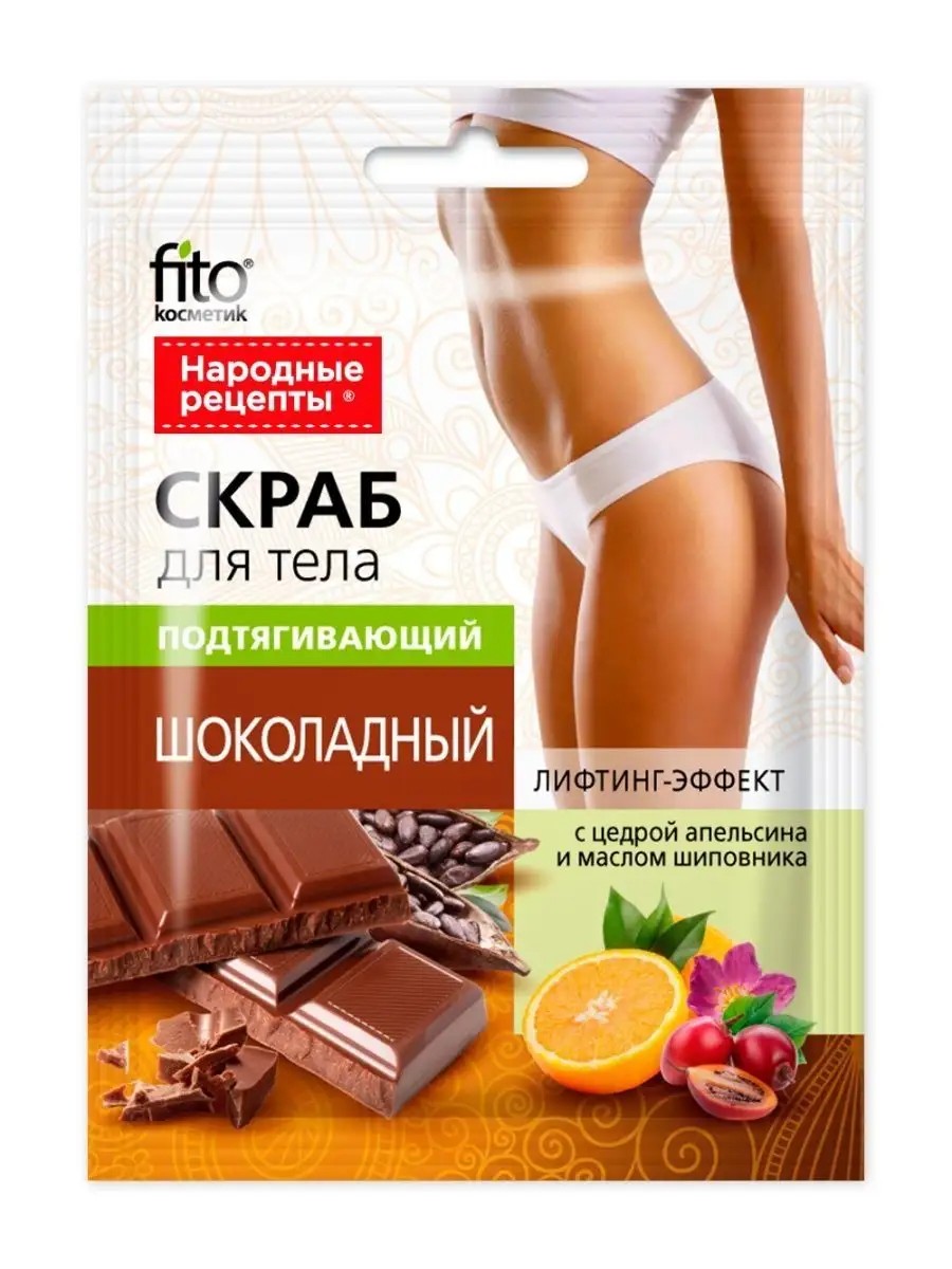 Fito косметик Скраб для тела, Шоколадный 100 г. Скраб на основе сахара и молотой цедры апельсина деликатно очищает и обновляет кожу, делает ее подтянутой, молодой и упругой. Скраб содержит в составе черный шоколад, обладающий мощным лифтинг-эффектом, тонизирует и омолаживает кожу. Скраб с цедрой апельсина отшелушивает и подтягивает кожу. Скраб глубоко питает, увлажняет и смягчает кожу. Скраб с чарующим ароматом шоколада превращает принятие душа в настоящую SPA процедуру и дарит отличное настроение. Скраб сделает кожу ровной, подтянутой, соблазнительной, без признаков целлюлита.