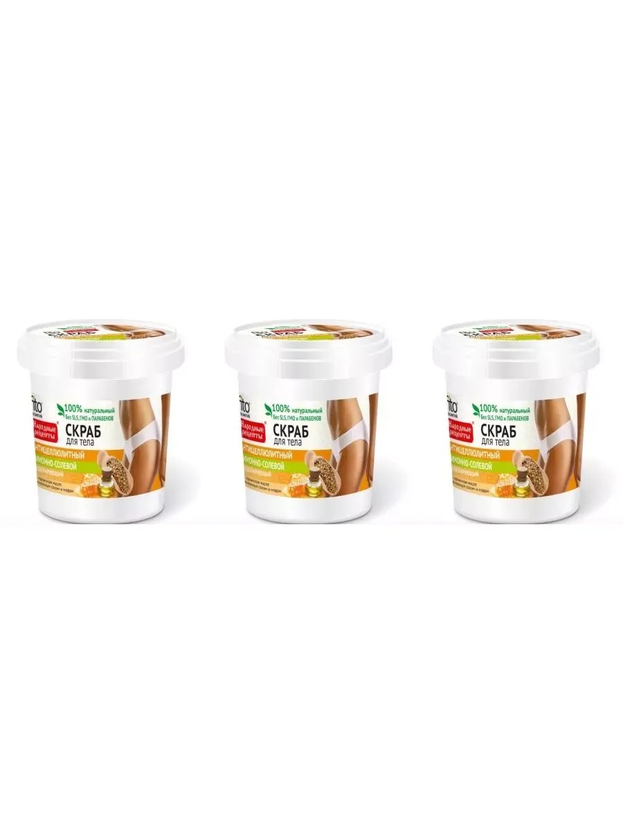 Скраб для тела лимонно-солевой 155 мл 3 шт. Натуральная морская соль, сок лимона, мед и горчичное масло - это отличный народный рецепт для ликвидации всех признаков целлюлита. Активный скраб на основе морской соли помогает отлично бороться с целлюлитом, а свежий аромат лимона заряжает отличным настроением!Мед смягчает и устраняет сухость, очищает поры, делает кожу гладкой и бархатистой. Лимонный сок повышает эластичность и упругость, ускоряет процессы обновления кожи и возвращает ей тонус. Горчичное масло обладает сильным антиоксидантным свойством, способствует расщиплению подкожного жира и улучшению контуров тела.
