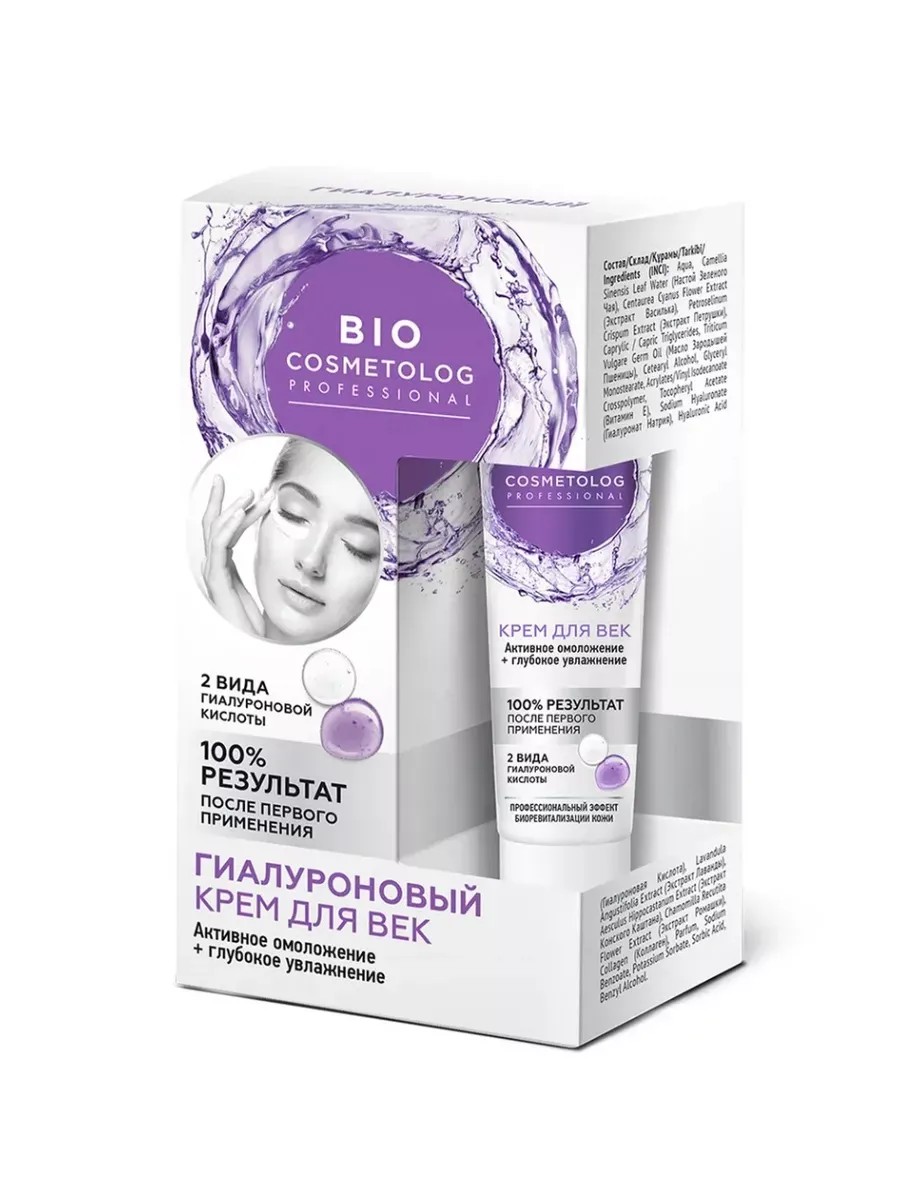 This hyaluronic acid eye cream with a biorevitalizing effect instantly fills in fine lines, rejuvenates the delicate skin of the eyelids, and leaves a fresh, rested look. Its active formula, with two types of hyaluronic acid and collagen, deeply hydrates, strengthens, smoothes, and lifts the skin around the eyes. Green tea infusion and cornflower and parsley extracts quickly eliminate puffiness and dark circles, wheat germ oil deeply nourishes and regenerates, chamomile extract relieves tension, and vitamin E initiates the skin's self-rejuvenation process. Daily use of this cream completely replaces professional biorevitalization procedures.