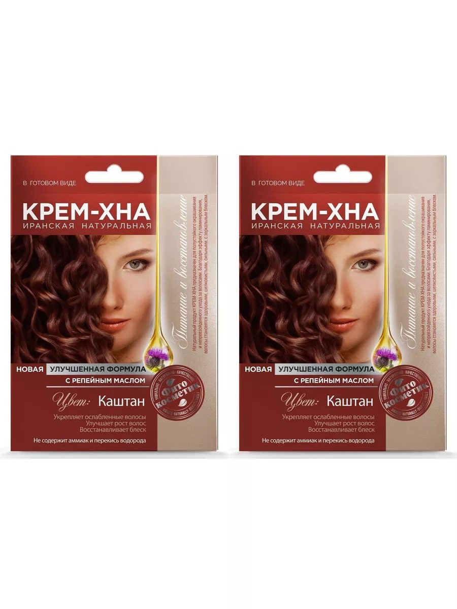 Хна обеспечит натуральное окрашивание без повреждения структуры волос, укрепит структуру и улучшит внешний вид локонов. Крем краска хна, обогащенная репейным маслом, дарит волосам глубокий, насыщенный каштановый цвет. Готовая, стойкая крем хна, благодаря витаминами и эфирным маслам, интенсивно питает, крем хна увлажняет, и восстанавливает локоны. Крем хна не содержит аммиак и перекись водорода, бережно окрашивает не вызывая повреждения структуры прядей. Крем краска хна в готовом виде наполняет пряди жизненной силой и энергией от корней до кончиков, хна придает ослепительный блеск и объем. Крем краска хна отлично закрашивает седину, при правильном применении не оставляет проплешин. Стойкая крем хна укрепляет ослабленные, секущиеся волосы, дарит волосам насыщенный каштановый цвет. Состав: Вода, репейное масло, масло сладкого миндаля, экстракт женьшеня, масло зародышей пшеницы, глицерин, кокамидопропилбетаин, пропиленгликоль, гидролизованный кератин, диметикон, ксантановая камедь, пантенол или витамин В5, молочная кислота, бензойная кислота, сорбиновая кислота, дегидроуксусная кислота, бензиловый спирт, фиолетовая кислота 43, HC Red 3, HC Yellow 2, N,N-Bis( 2-гидроксиэтил)-2-нитро-п-фенилендиамин.В комплекте 2 упаковки.